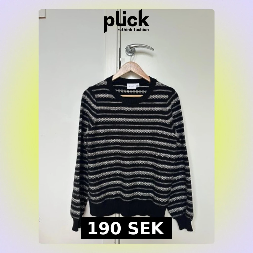 Snygg svart stickad tröja från Vila i storlek S med vita horisontella ränder och diskret mönster. Rund halsringning och ribbade muddar vid ärmslut och nederkant. Perfekt för dig som gillar klassisk stil med en twist, nedre mudden går att vika in för en kortare look. Tecken på användning men i övrigt väldigt bra skick, inte nopprig men lite utåt stickande ludd (se bilder). Super mjukt och skönt stretchigt material. Nypris: 349kr