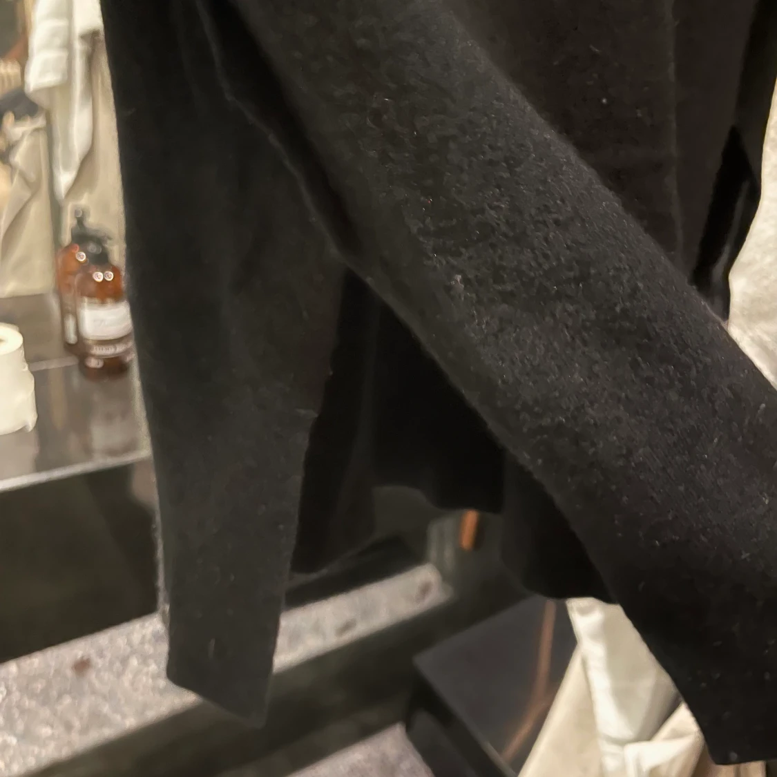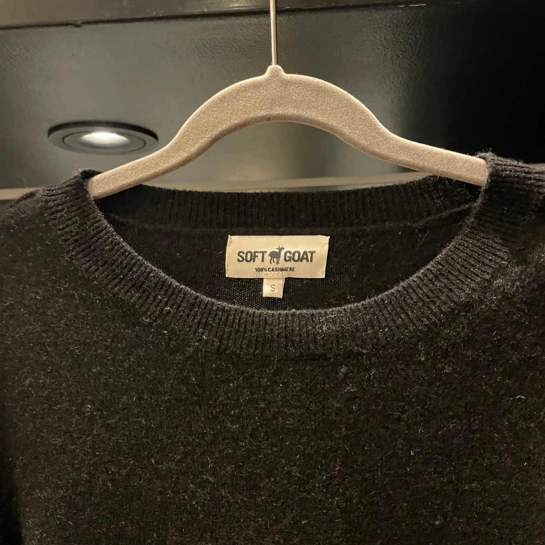 Svart Kashmirtröja från Softgoat i storlek small, men något litet så skulle säga passar en xs. Något längre i modellen. Har öppna slag i midjan (se bild) tröjan är inlämnad hos skräddare pga gick upp lite i slagen, men det är fixat, det syns när man kollar nära, därav det låga priset jag angett. Men annars superfint skick!