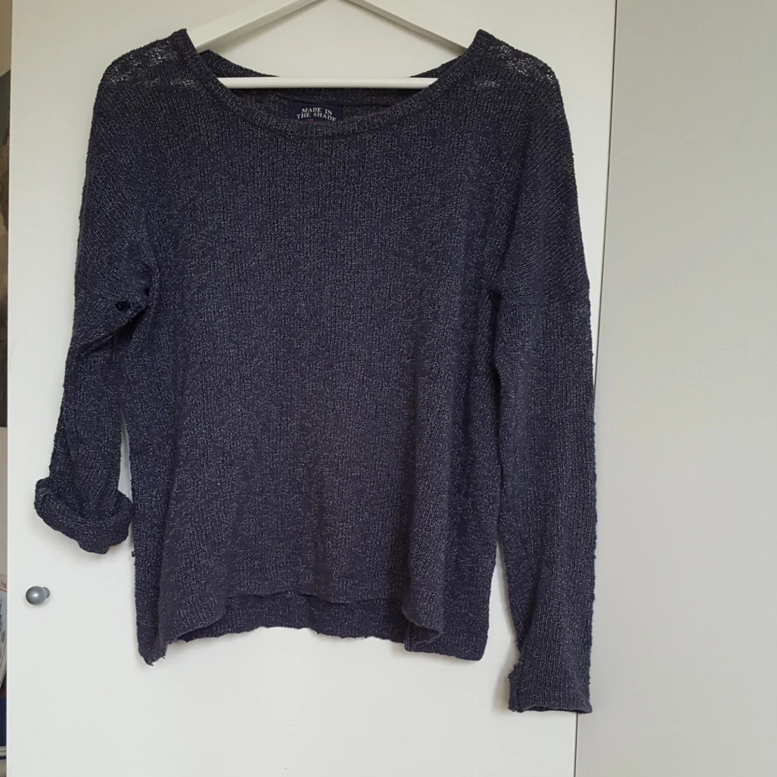 Mörkblå stickad tröja från SOLO, har tyvärr en skada i ärmen, därav det låga priset men ärmarna är väldigt snygga upprullade.