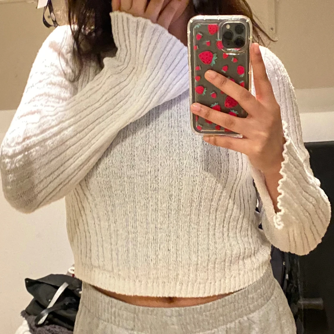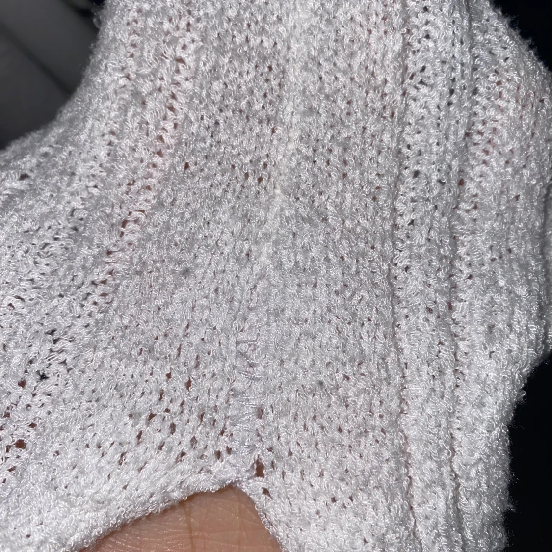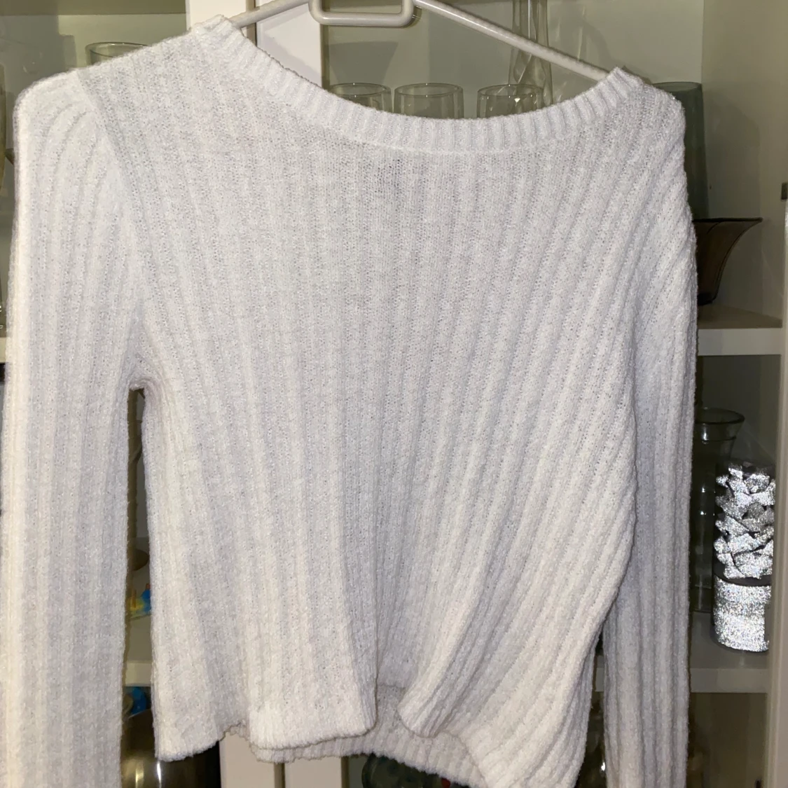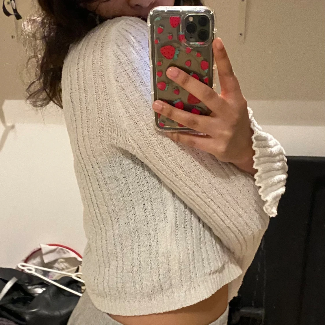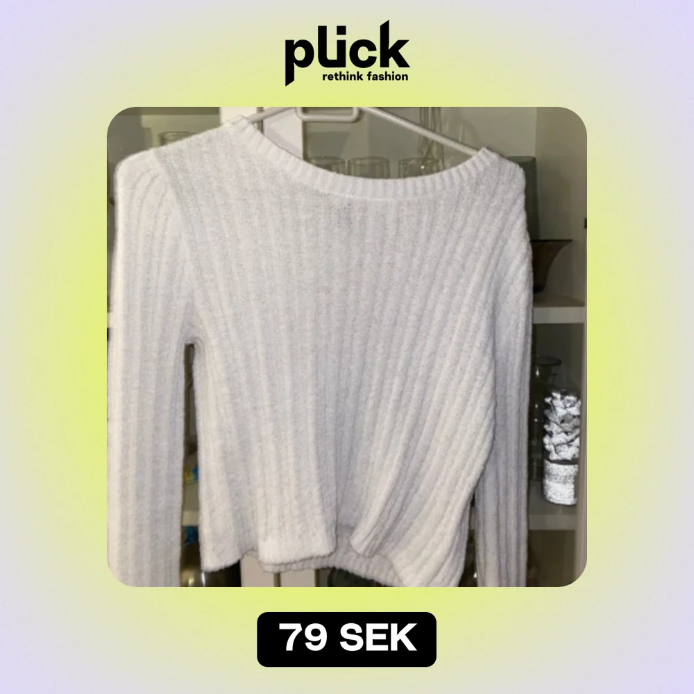 en fin vit stickad tröja, den är lite kort vid magen och har utsvängningen vid slutet av armen. Jag har sytt upp den lite vid utsvängningen för att innan tyckte jag att den va lång, men det är något du kan ta bort om du inte vill ha den.
