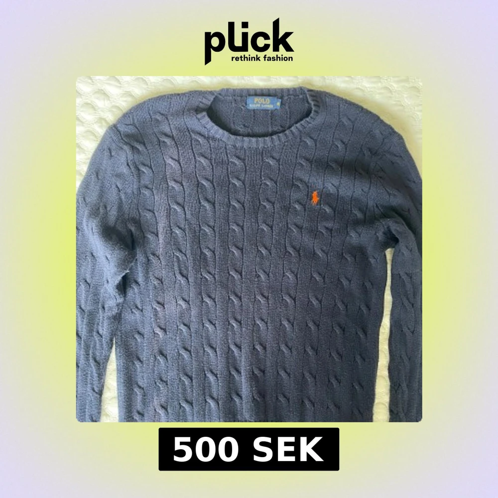 Snygg marinblå kabelstickad tröja från Polo Ralph Lauren i storlek M. Tröjan har lång ärm, rund hals och klassisk orange logga broderad på bröstet. Perfekt för dig som gillar preppy stil och vill ha något som funkar året runt.