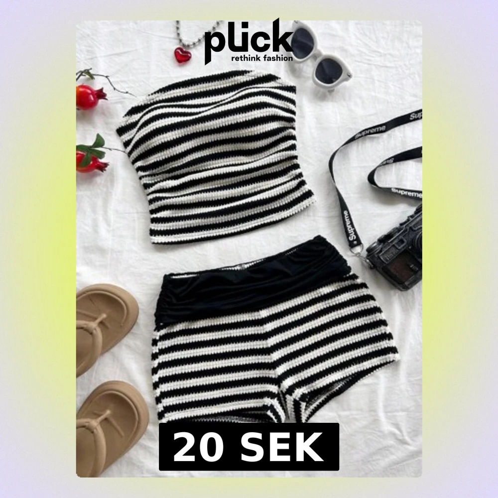 Säljer stickat set med svartvita ränder och bred midja. Aldrig använd
