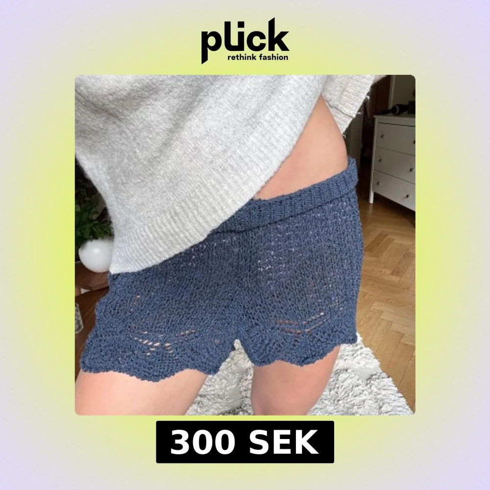 Säljer ett par blå virkade shorts från Zara med snyggt mönster och vågig kant nertill. Shortsen har en elastisk midja och är perfekta för varma dagar. Superfina att styla med en enkel topp eller stickad tröja.