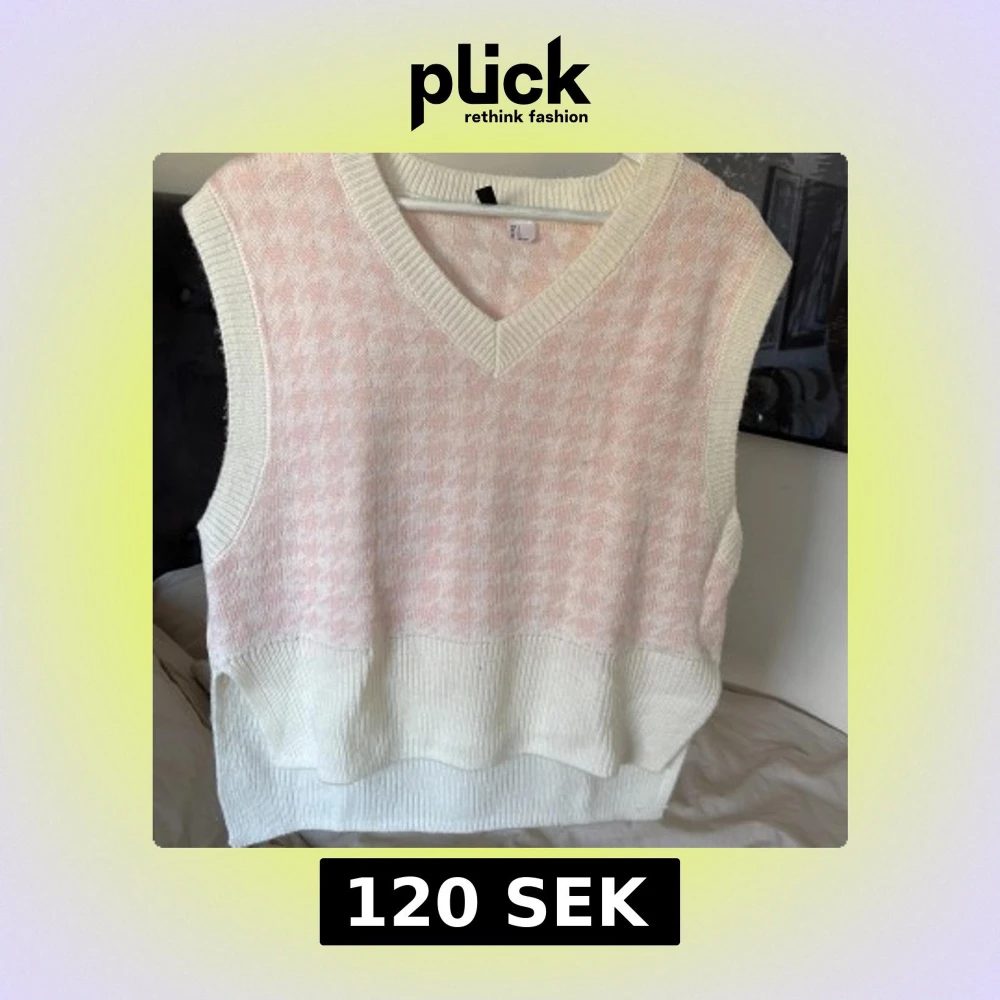Säljer en söt stickad väst i rosa och vitt med ett diskret mönster. Västen har en v-ringad design och är perfekt för lager-på-lager-stil. Den är mjuk och bekväm, idealisk för både vår och sommar.