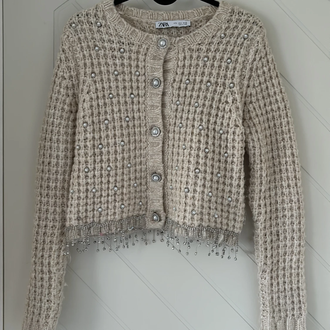 Stickad tröja med stenar som kan användas både som kofta och tröja💗den är köpt från zara och är i storlek S. Den har inte kommit till användning så därför säljer jag. Skriv för fler bilder eller frågor💗(katt finns i hemmet)