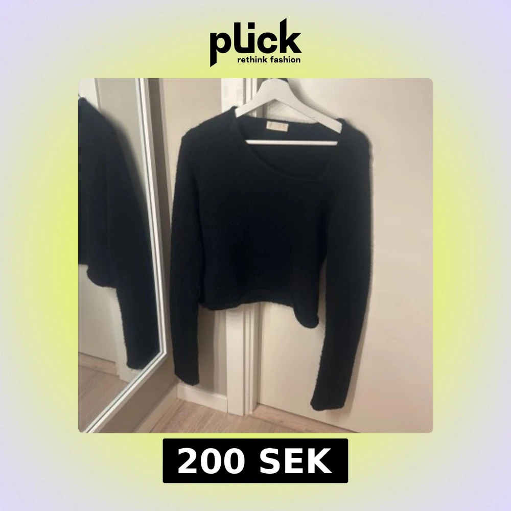 Trendig svart stickad tröja med lång ärm och en cool asymmetrisk halsringning. Modellen är croppad och har en mjuk, lite luddig struktur. Perfekt att styla med höga jeans eller kjol för en avslappnad look. Storlekstår ej men passar xxs-s - ingen defekt men lite nopprig.