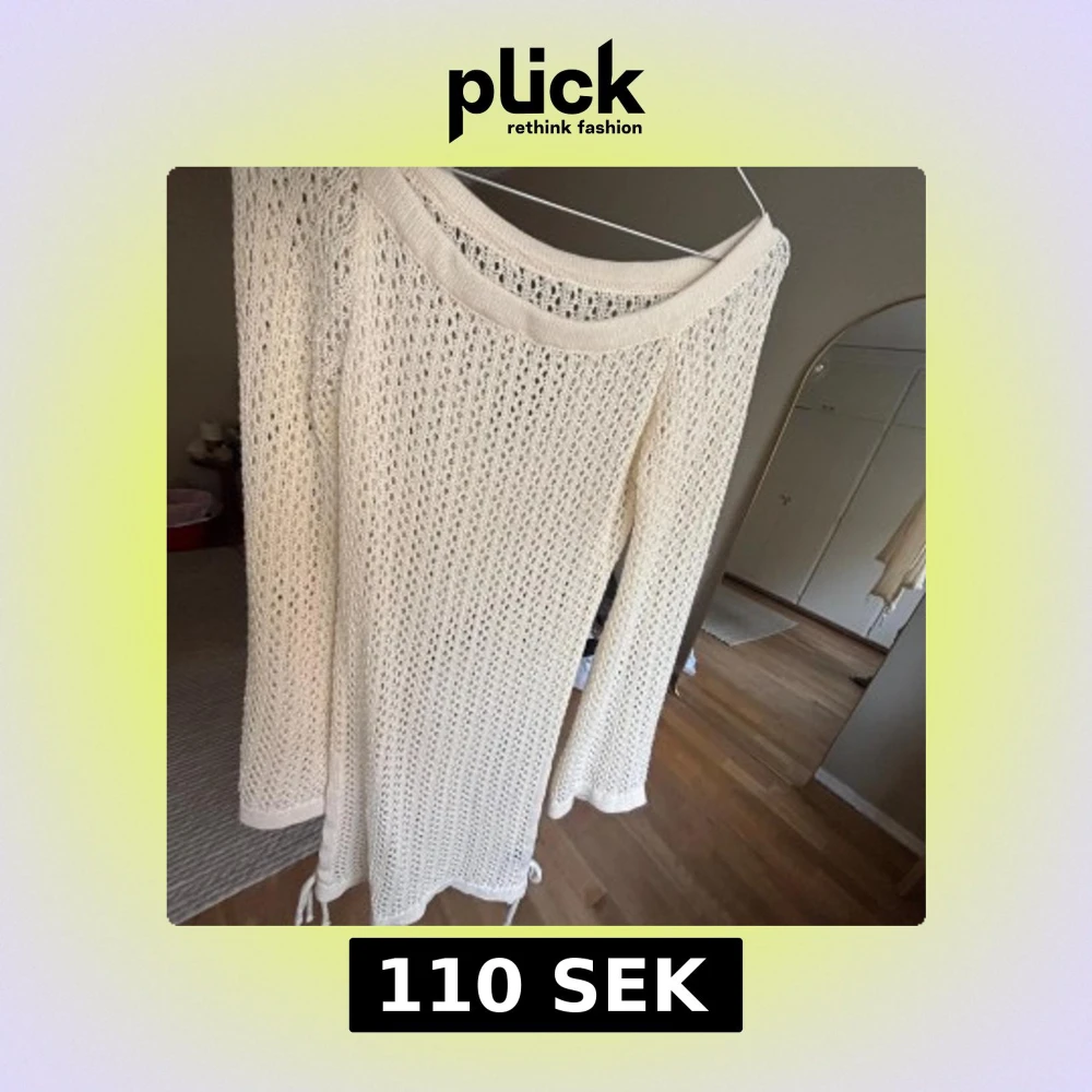 Säljer en vit stickad långklänning med snyggt hålmönster och långa ärmar. Klänningen har snörning i nederkant och en bred, rundad halsringning som ger en chill vibe. Perfekt för dig som gillar boho och vill ha något luftigt och unikt.