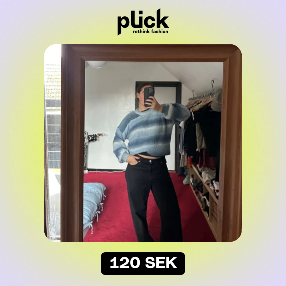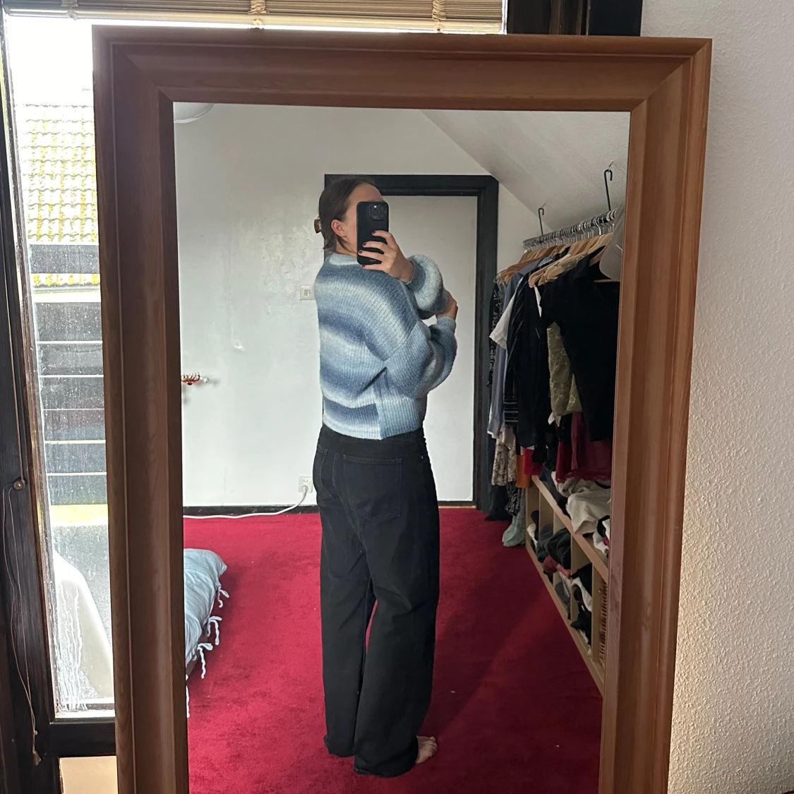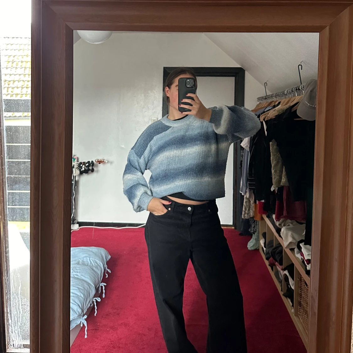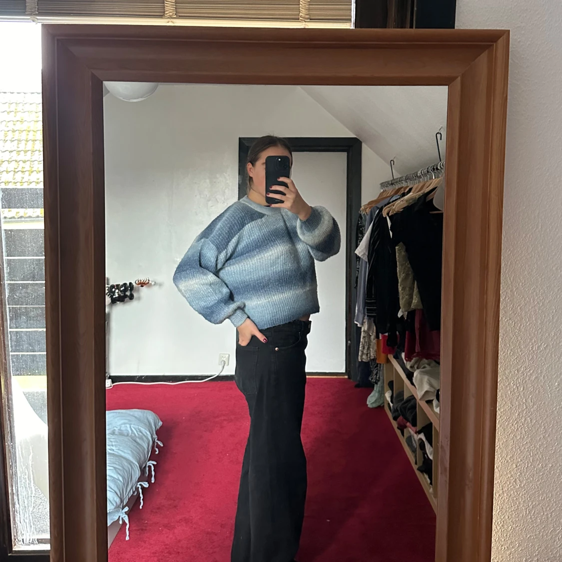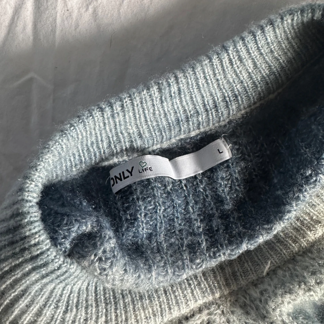 Mjuk stickad tröja i blåa färger. Använd max två gånger. Storleken är L, men den är mer som en oversized M.