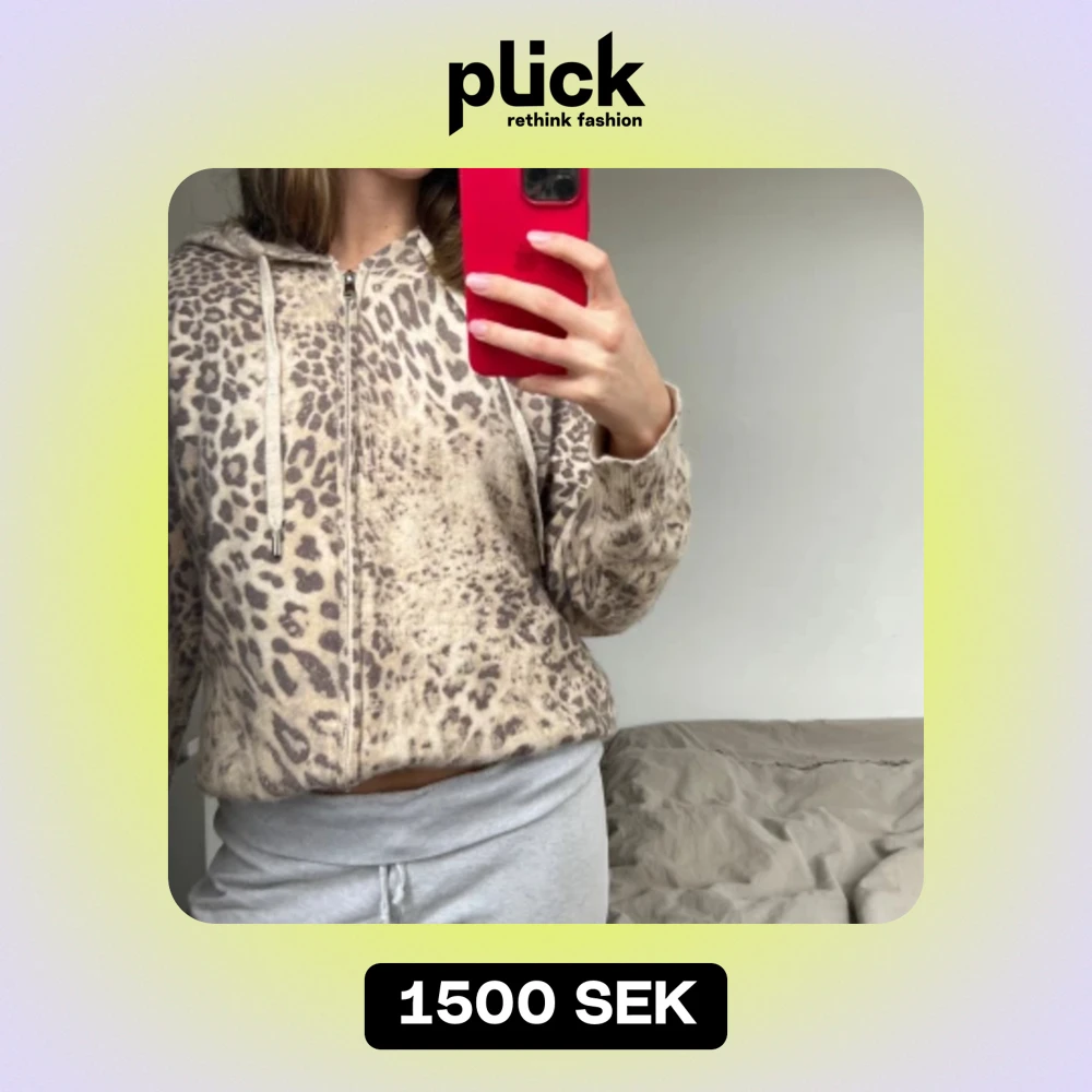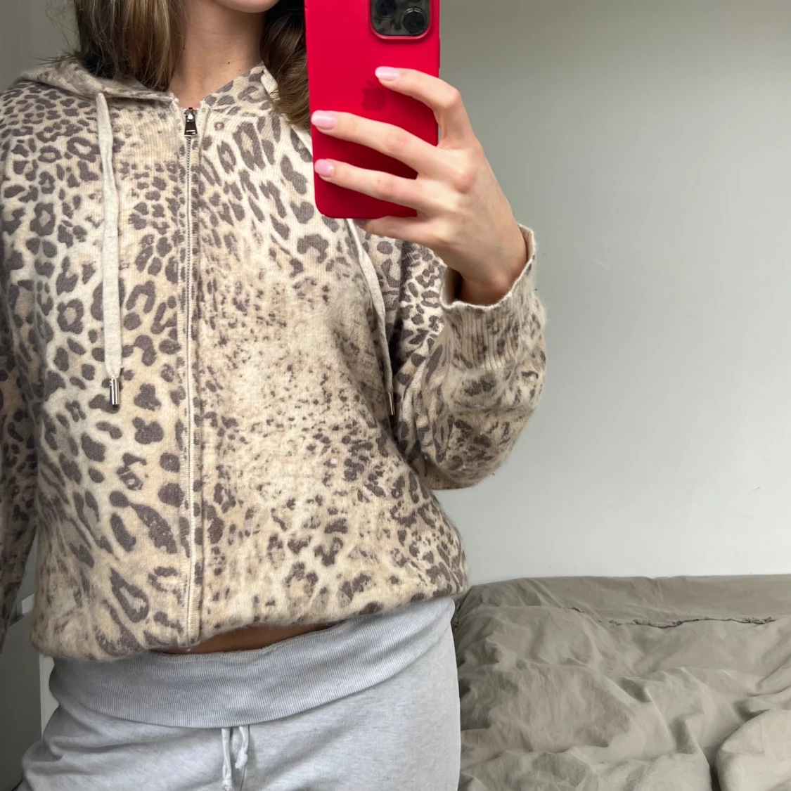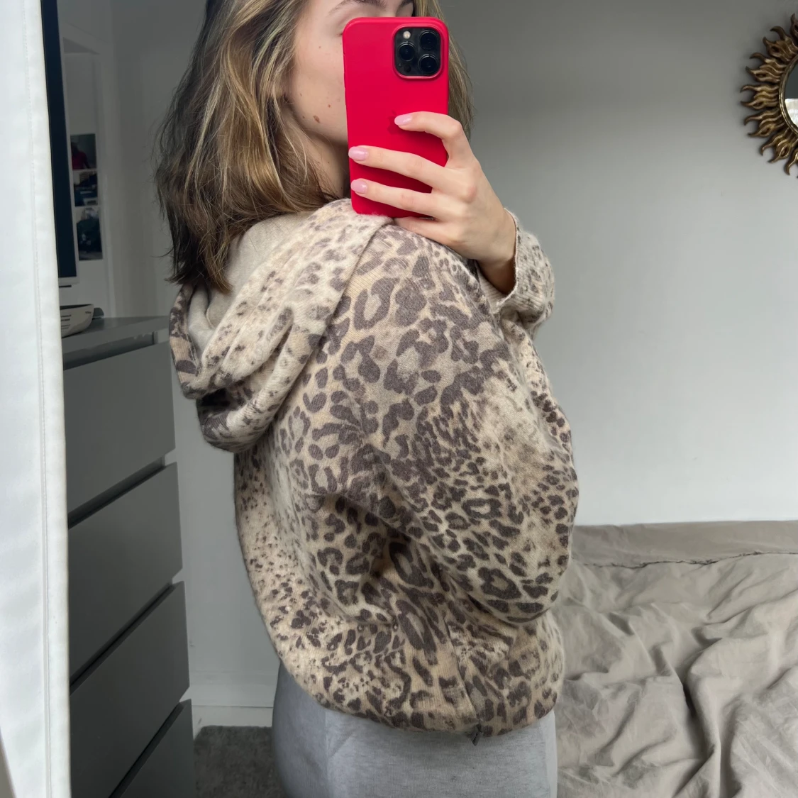 Stickad ziphoodie med leoprint. Materialet känns som Kashmir och den är lite oversized, supermysig🧸 Det står att storleken är 46 men skulle säga att den gör sig mer rättvis som en 38/Medium. Aldrig använd men har tagit bort prislapp!