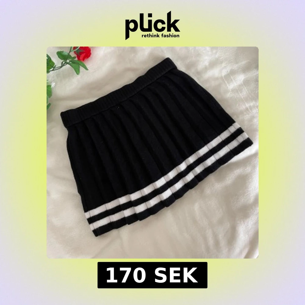 Snygg svart kortkjol från Cherry Mellow med vita ränder längst ner. Kjolen har en ribbad struktur och en elastisk midja för bekväm passform. Perfekt för en trendig look! Ny utan prislapp. Mått - midja: 36cm - Längd: 34cm