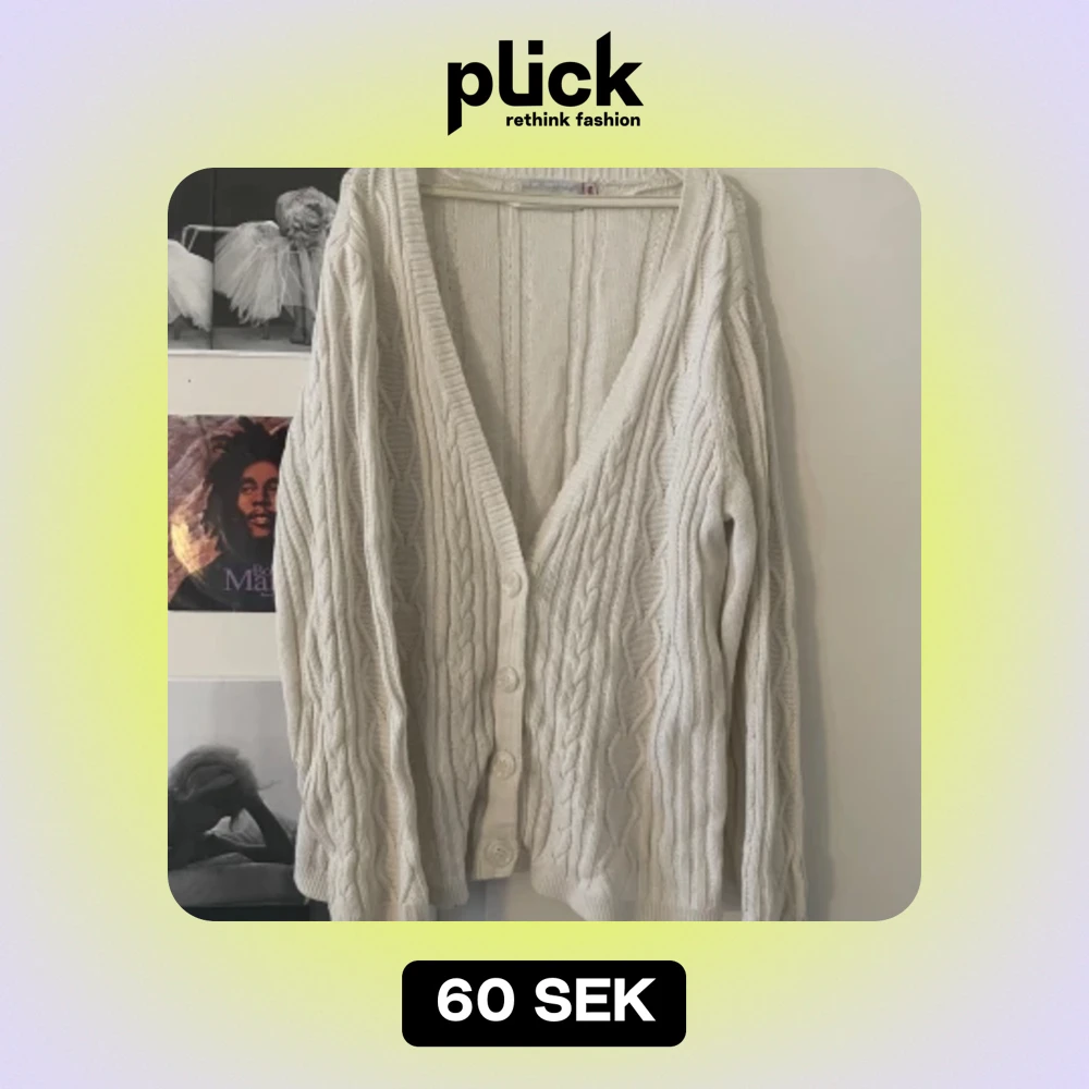 Kabel stickad cardigan med knappar. Står storlek 48/50, jag skulle säga att de är storlek M-L. Jag brukar ha storlek xs-s men har använt denna oversize vilket oxå är superfint!