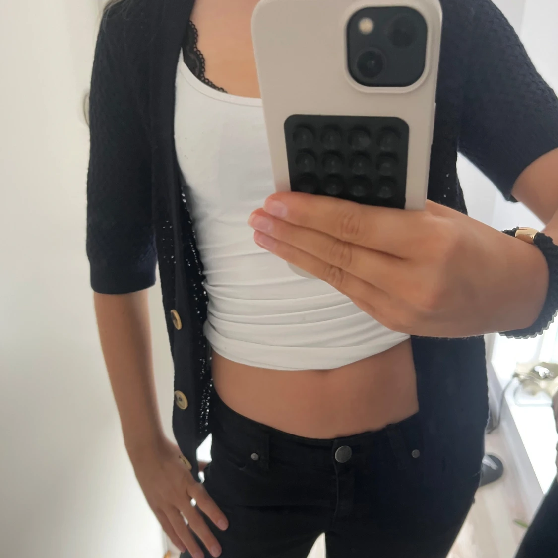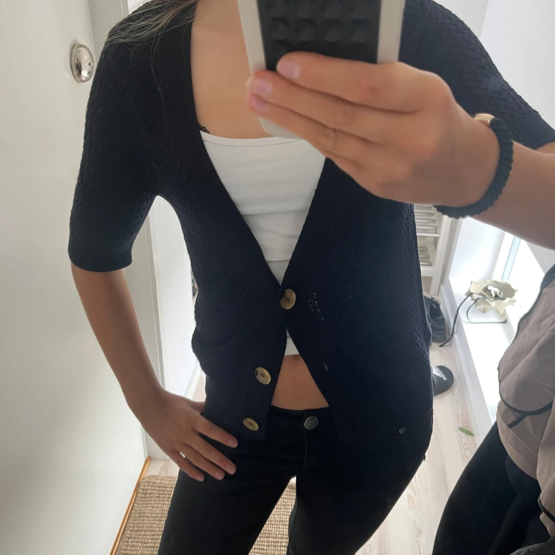 Säljer denna snygga mörkblåa stickade koftan i storlek xs, men passar även s💓nästan aldrig använd.