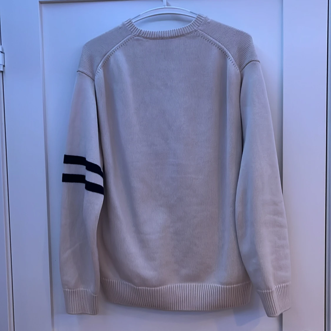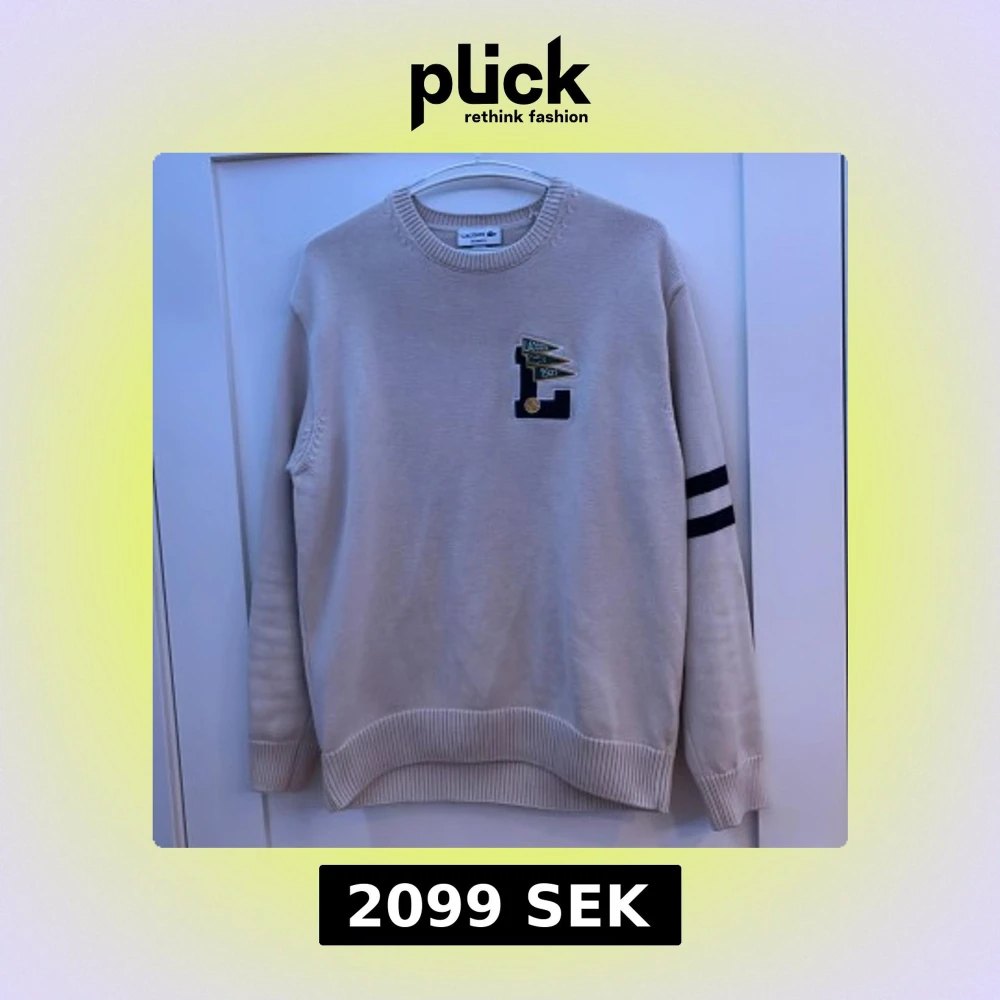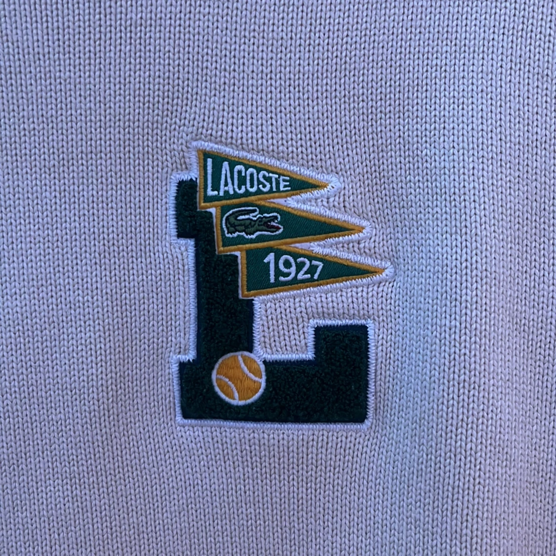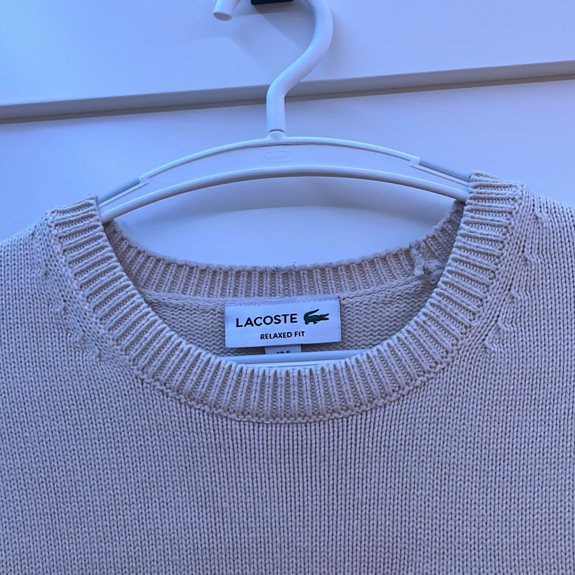 En grädd vit stickad Lacoste tröja. Mycket bra skick. Fler bilder kan skickas om så önskas. (det var dåligt ljus på bilderna)