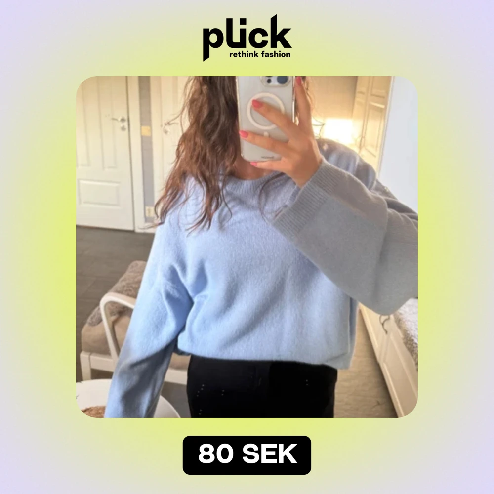 Hej! Jag säljer en mysig ljusblå stickad tröja i fint skick. Storlek L men jag har vantligtvis S och har använt den som en oversized tröja.
