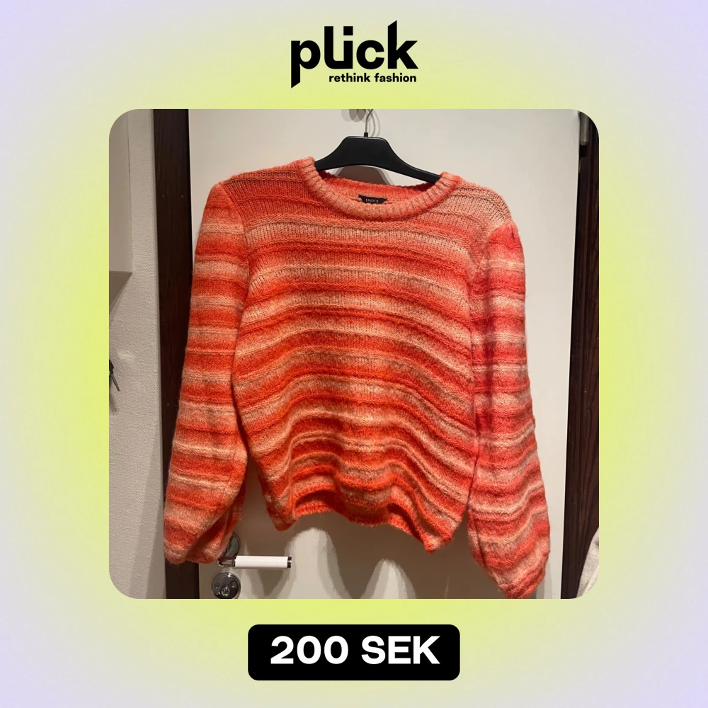 En supermysig stickad, randig, tröja med puffiga armar. Tröjan är randig i orangeröda färger. Säljer pga att den inte används. Varan är i bra skick då den endast används ett fåtal gånger.