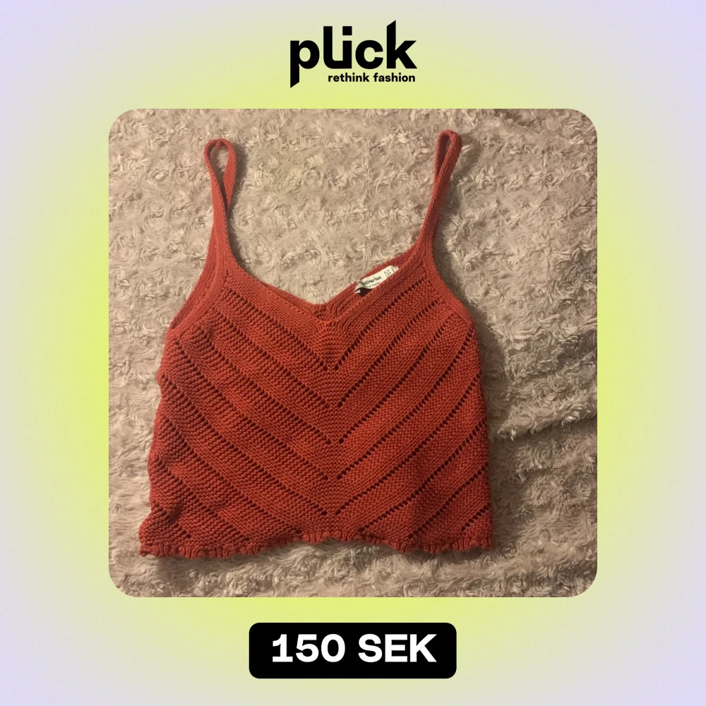 Säljer en superfin rostfärgad stickad linnetopp från Stradivarius. Toppen har en v-ringad design med smala axelband och ett snyggt mönster. Perfekt för sommardagar eller som ett lager under en jacka. Har använt den ett antal gånger och fick den av min syster men den är fortfarande i bra skick!