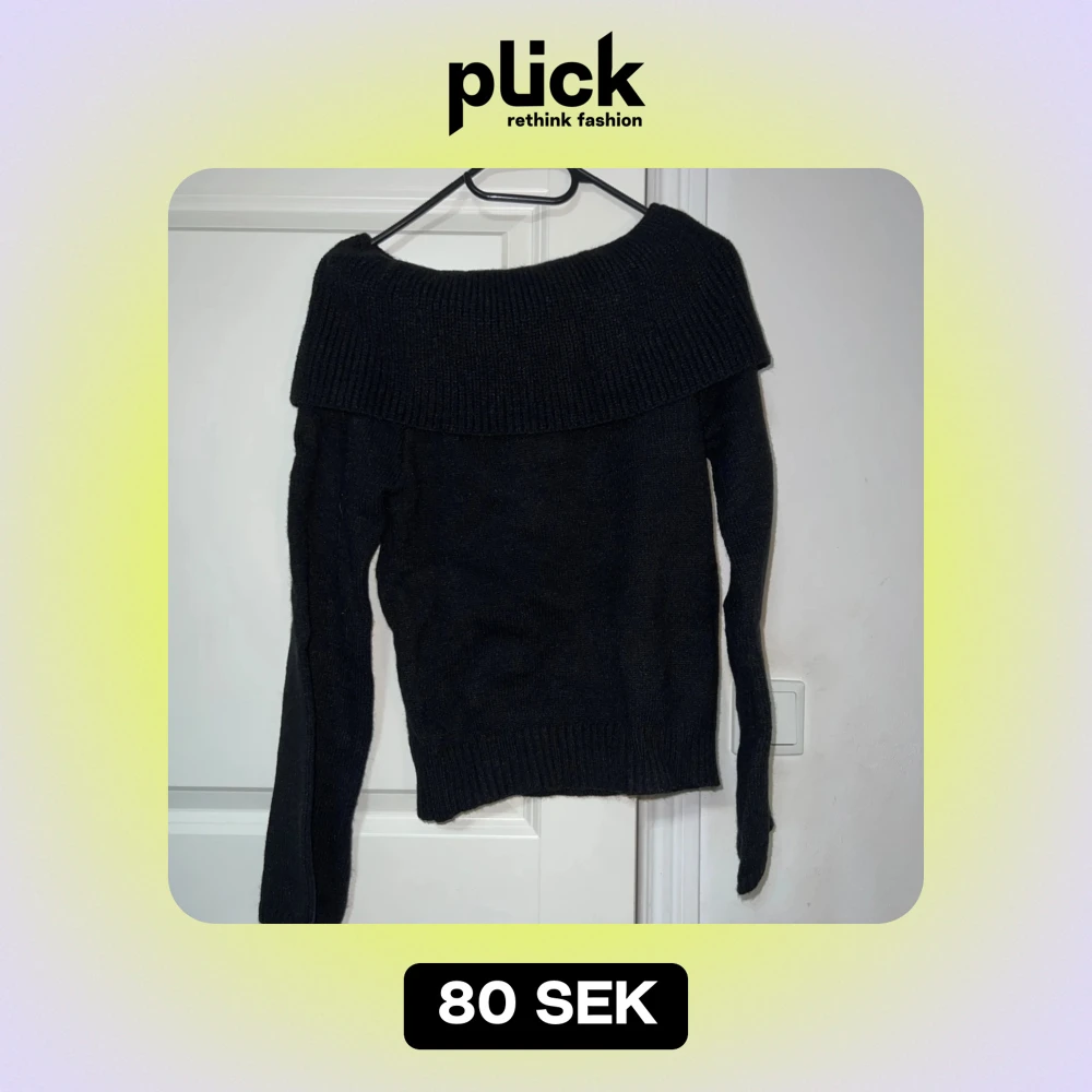 Säljer en superfin svart stickad tröja med offshoulder-design. Perfekt för höst och vinter, den är både stilren och mysig. Tröjan har långa ärmar och en bred krage som ger en elegant touch. Passar perfekt till både jeans och kjol!
