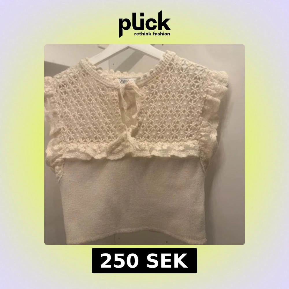 Vit stickad topp från Zara med spetsdetaljer och volanger. Toppen har en knytning framtill och är ärmlös - Bara provad, aldrig använd💞💞