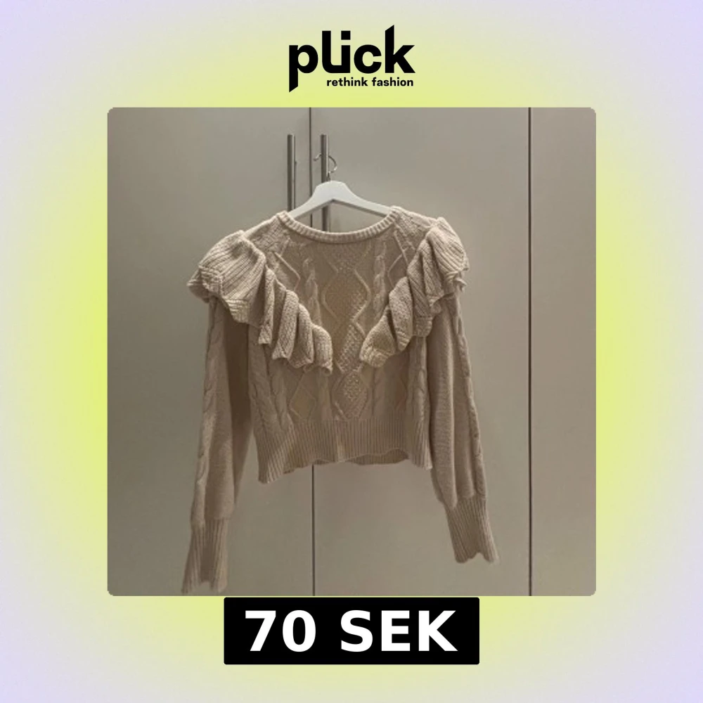 Beige stickad tröja i storlek S med volang detaljer över axlarna och kabelstickat mönster framtill. Tröjan har rund halsringning, långa ärmar och ribbade muddar. Väldigt mysig och i bra skick.💕Skriv för mer!