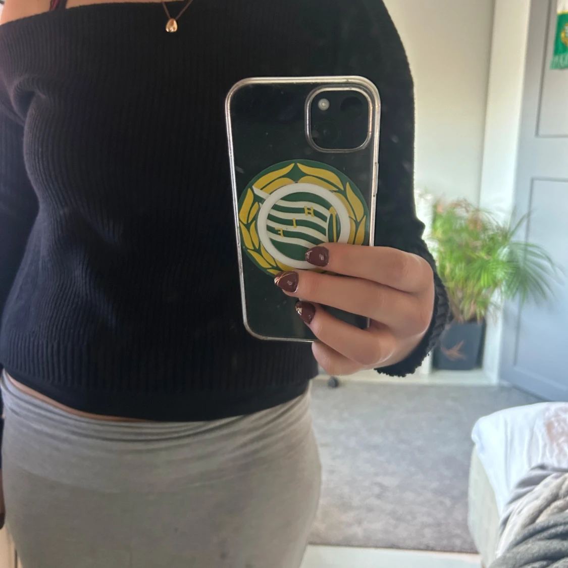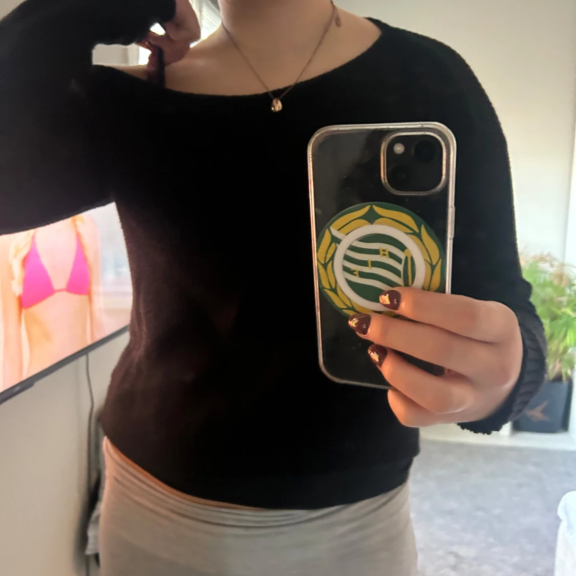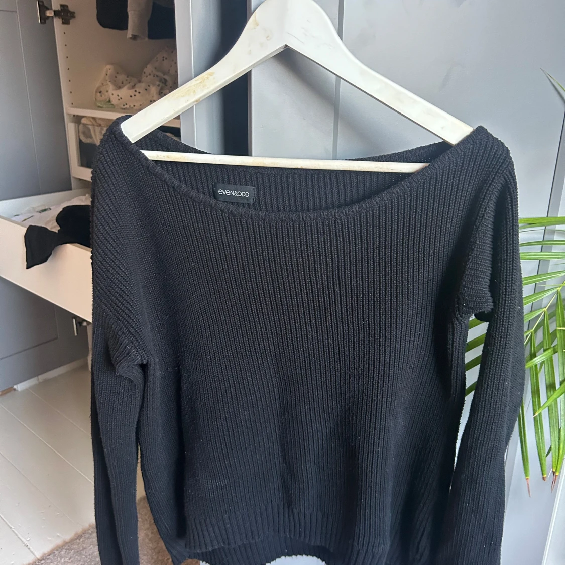 En stickad tröja som inte är så använd. Off shoulder på ena axeln.