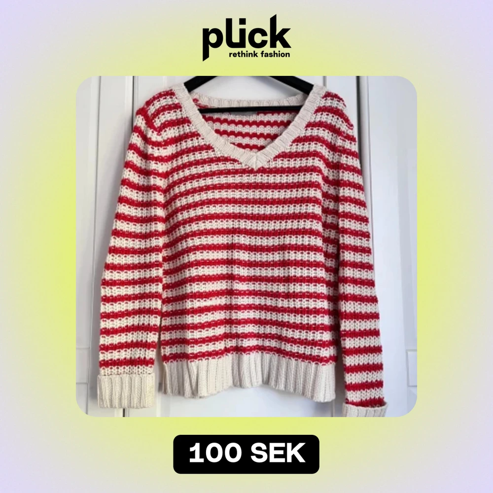 Säljer nu denna vit/rös randiga stickade tröjan, passar jätte bra nu till kalla sena sommarkvällar , den är i fint skick, hör av dig vid frågor 🩷