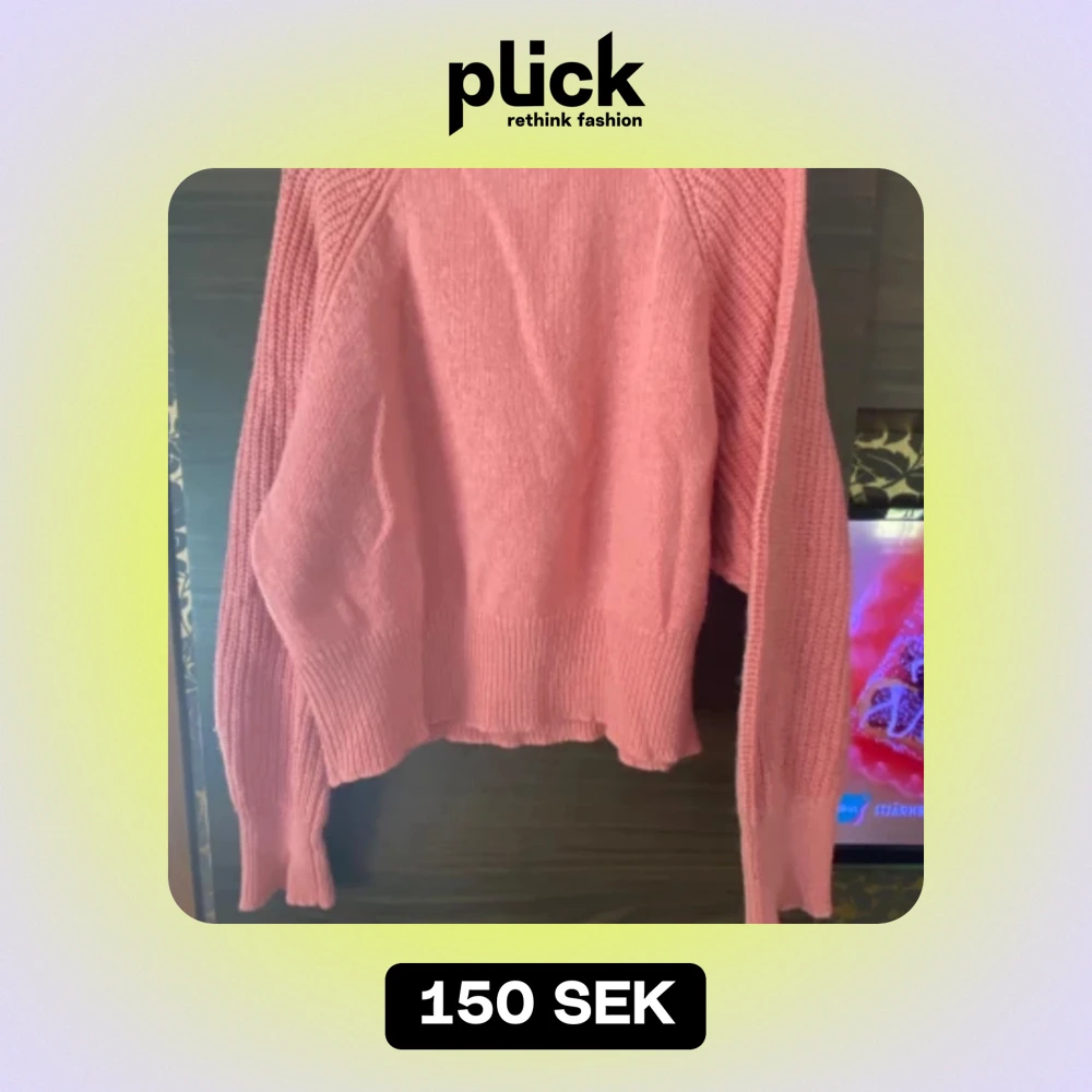 En rosa stickad tröja. Det är ett litet svart streck nere vid mudden på tröjan.