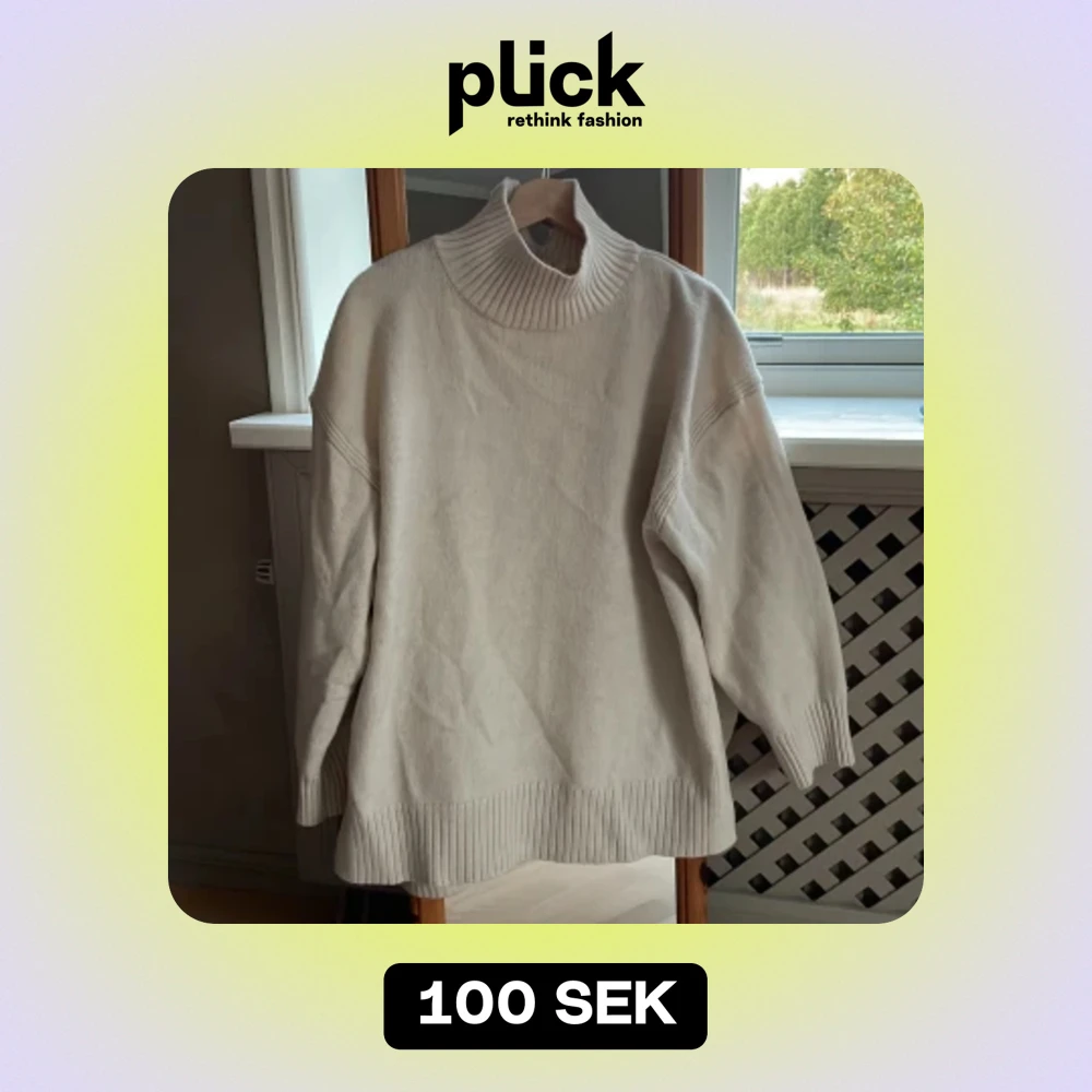 Ljus beige stickad tröja från H&M. Halvpolitisk med en liten slits i nacken, längre modell så den går ner strax under rumpan, Höga slits på båda sidor.