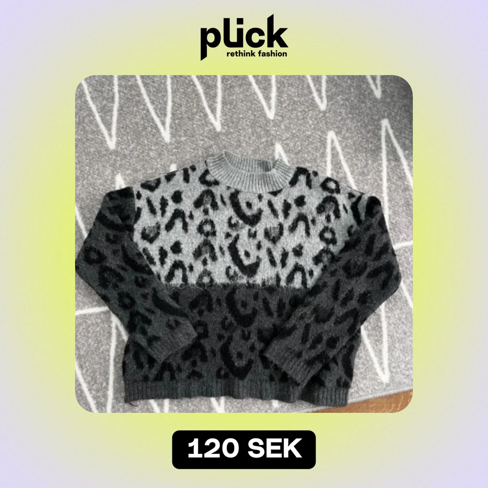 Stickad tröja i svart och grått leopard mönster. Använd men i fint skick. Storlek S. Köparen står för frakten🩷