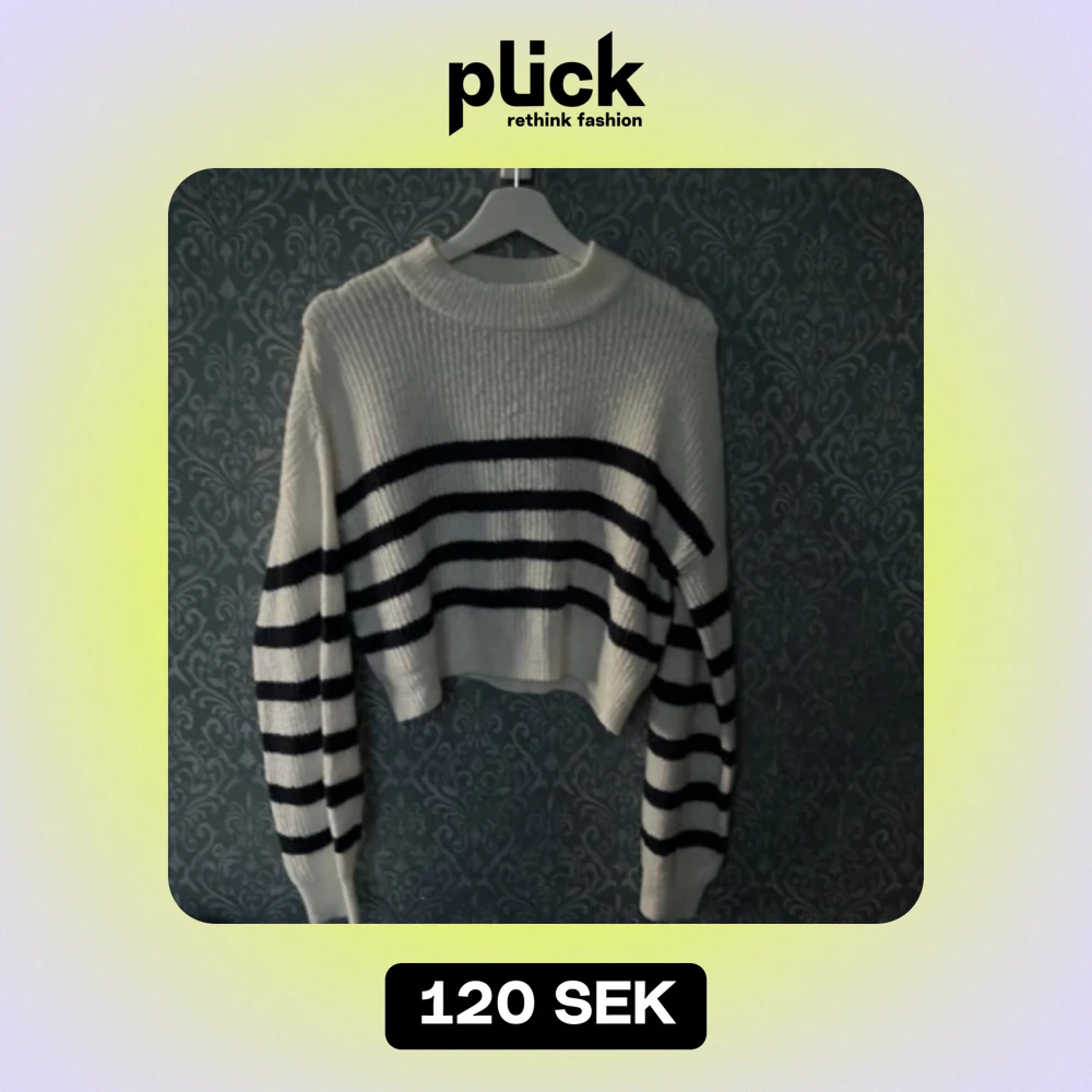 Något cropad, mjukt material som inte är sticksigt, storlek xs men stor i storleken, ränderna är mörkblå