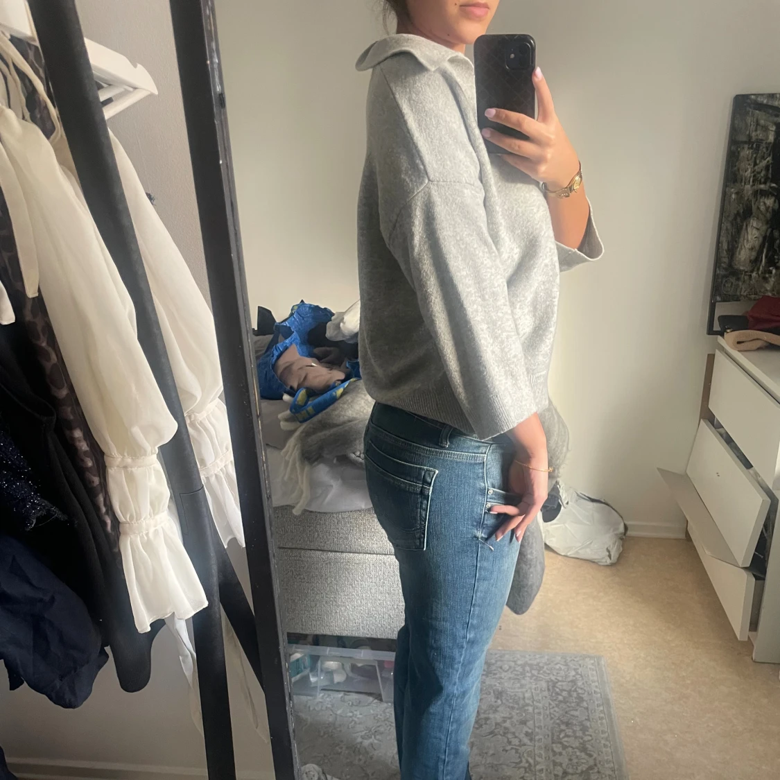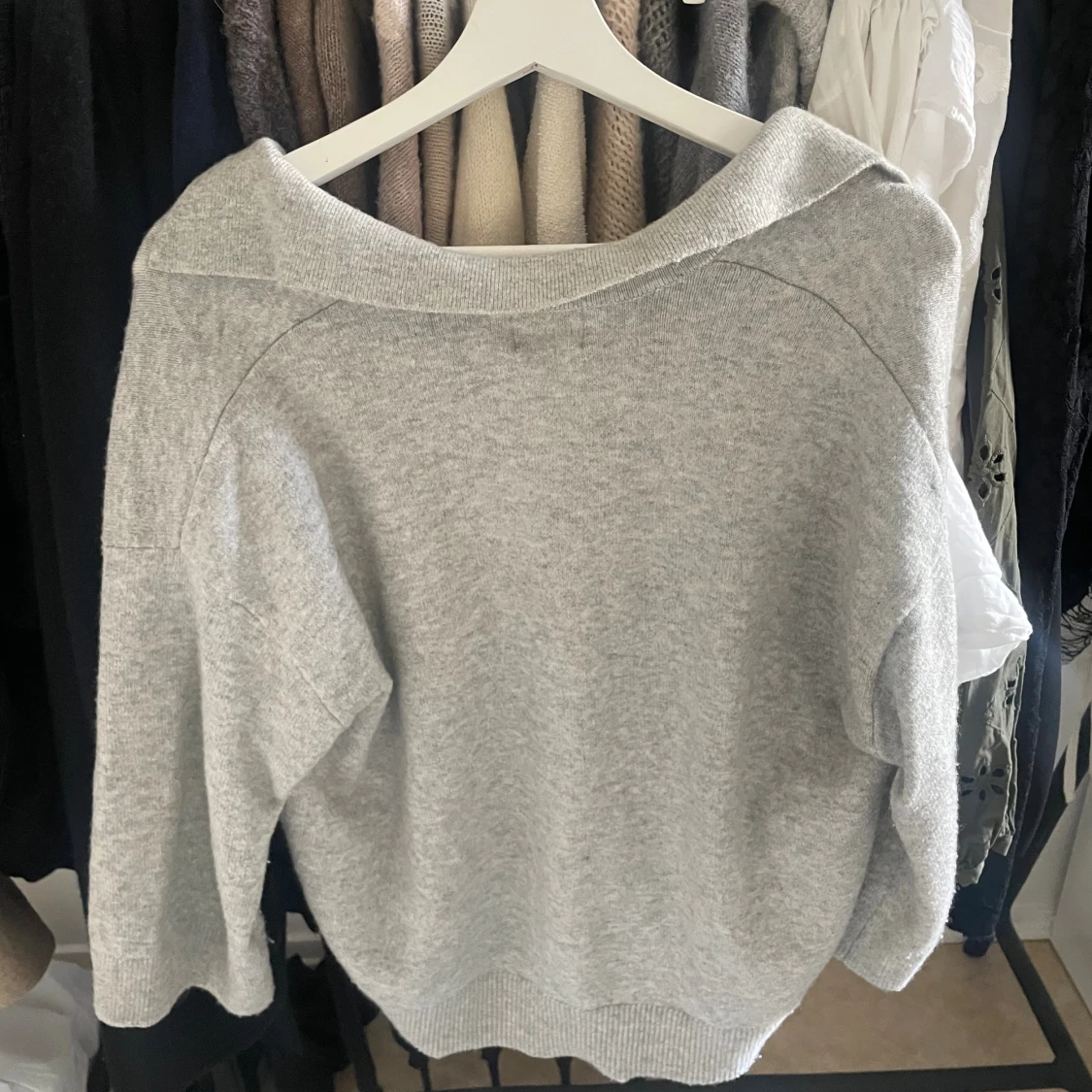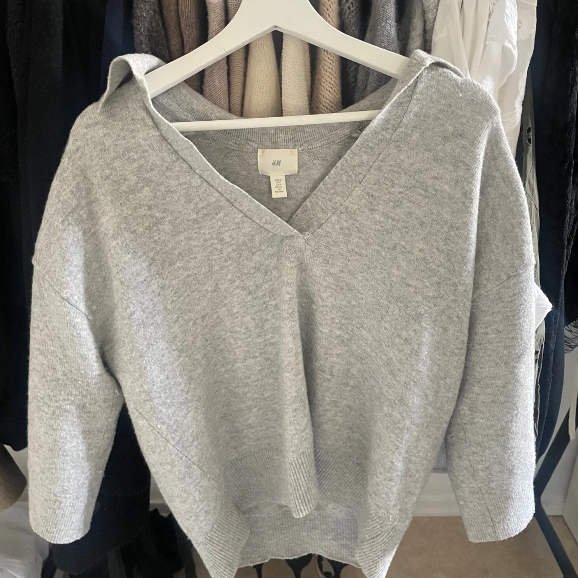 Stickad tröja med v-ring och krage i färgen grå, köpt på Hm men kommer inte till användning längre. Tröjan är i fint skick utan några defekter. Kontakta mig gärna vid frågor💕☺️