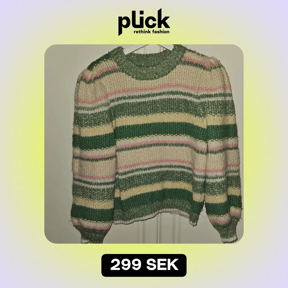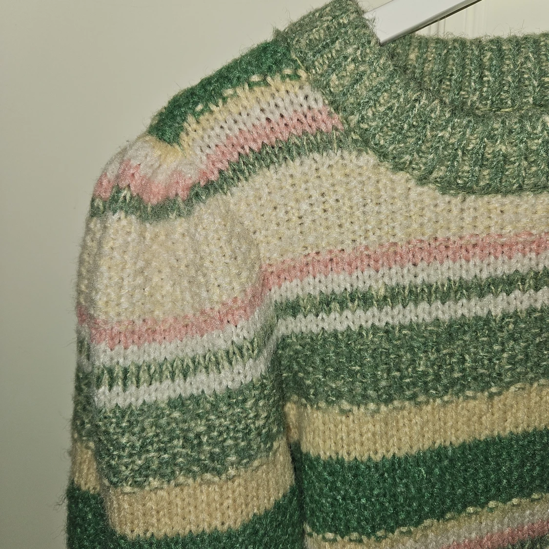 Nytt Snygg randig tröja med puffärmar och trekvarts. Tröjan är i en härlig färgkombination med grönt, rosa ,vitt och gult. Nypris 500 kr