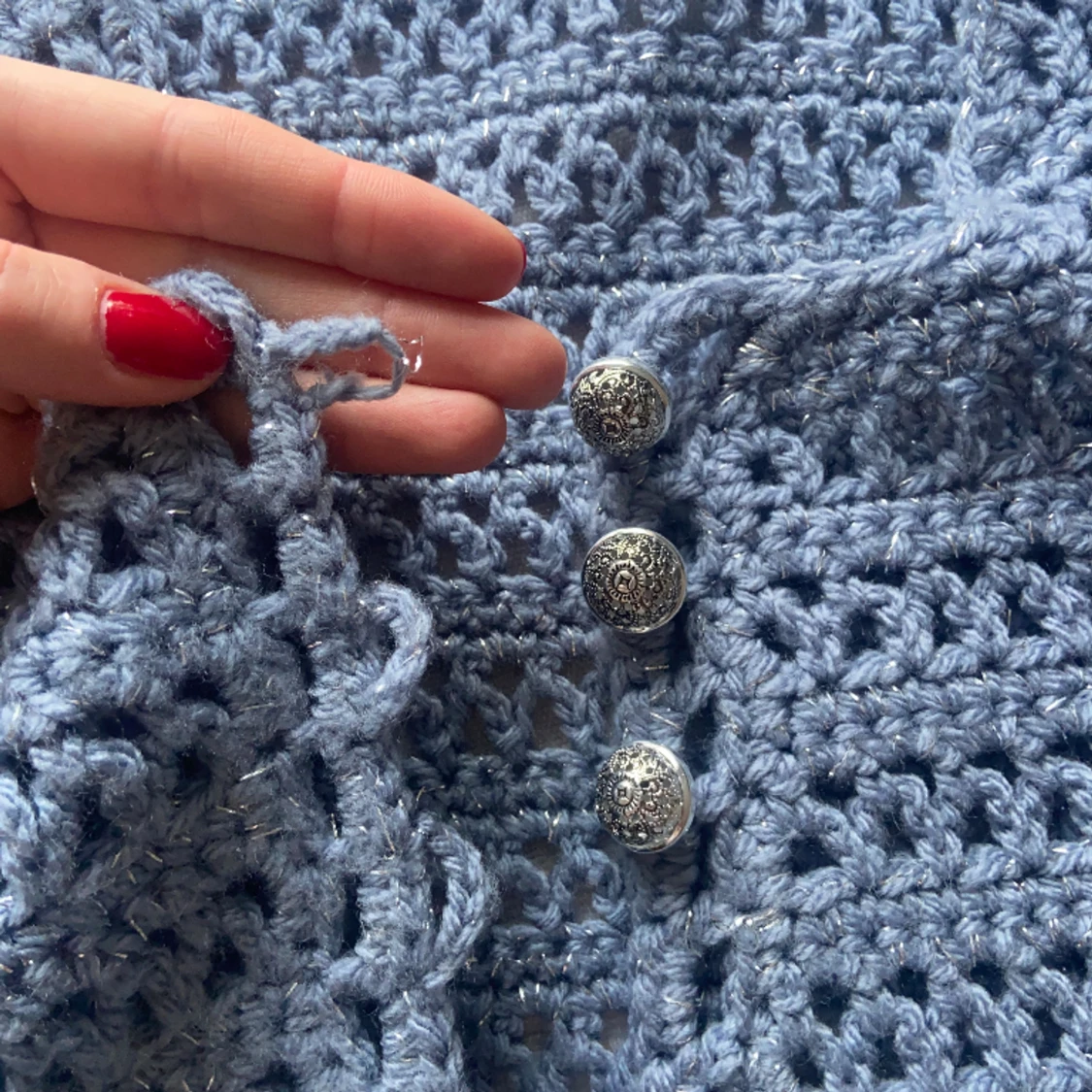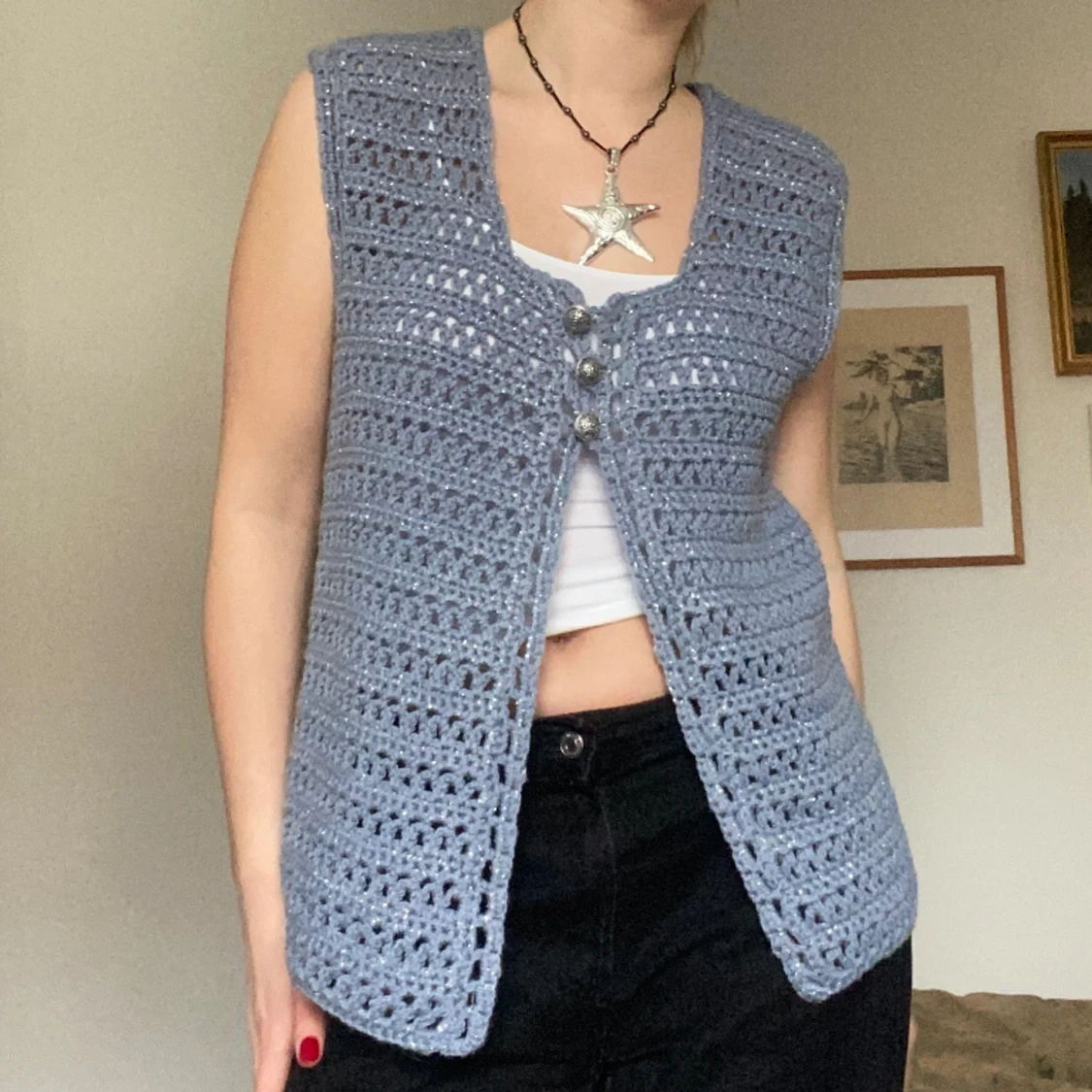 blå stickad väst med glittertråd! jättemysig 😎