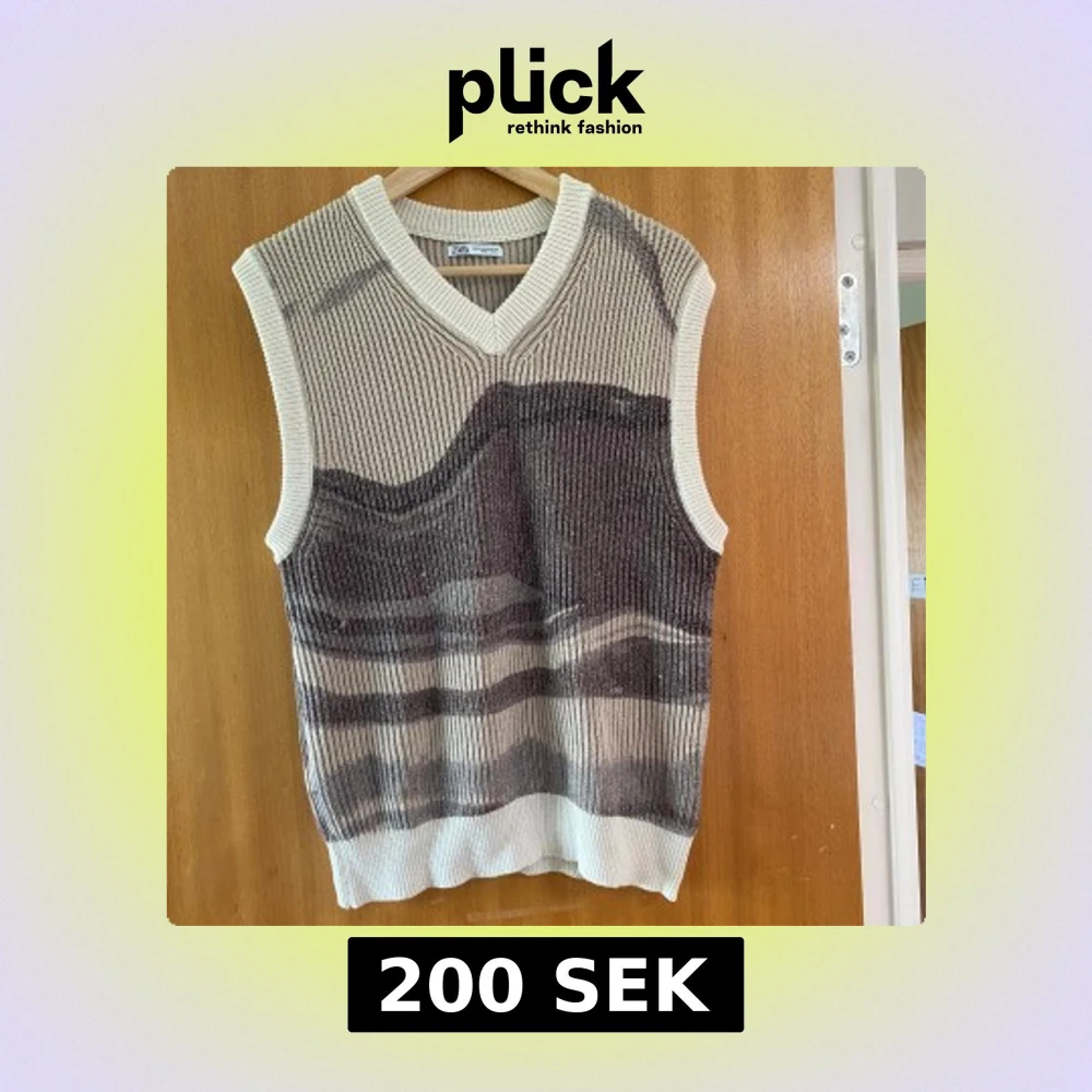 Stickad väst från Zara med ribbad struktur och v-ringning. Västen har ett vågigt mönster i beige och grå toner, vilket ger en cool och modern look. På sista bilden kan man se lite skador den har men inget man ser på långt håll