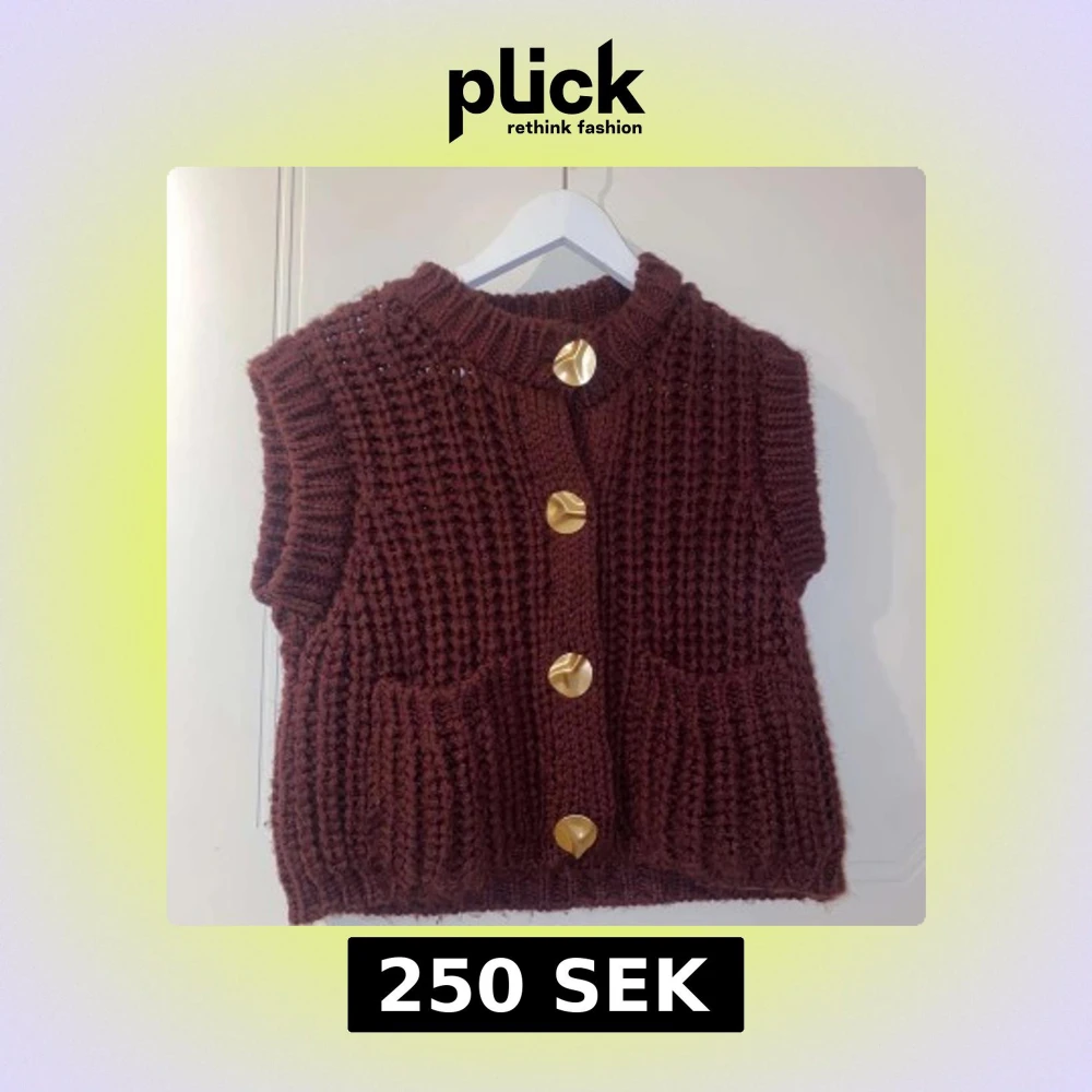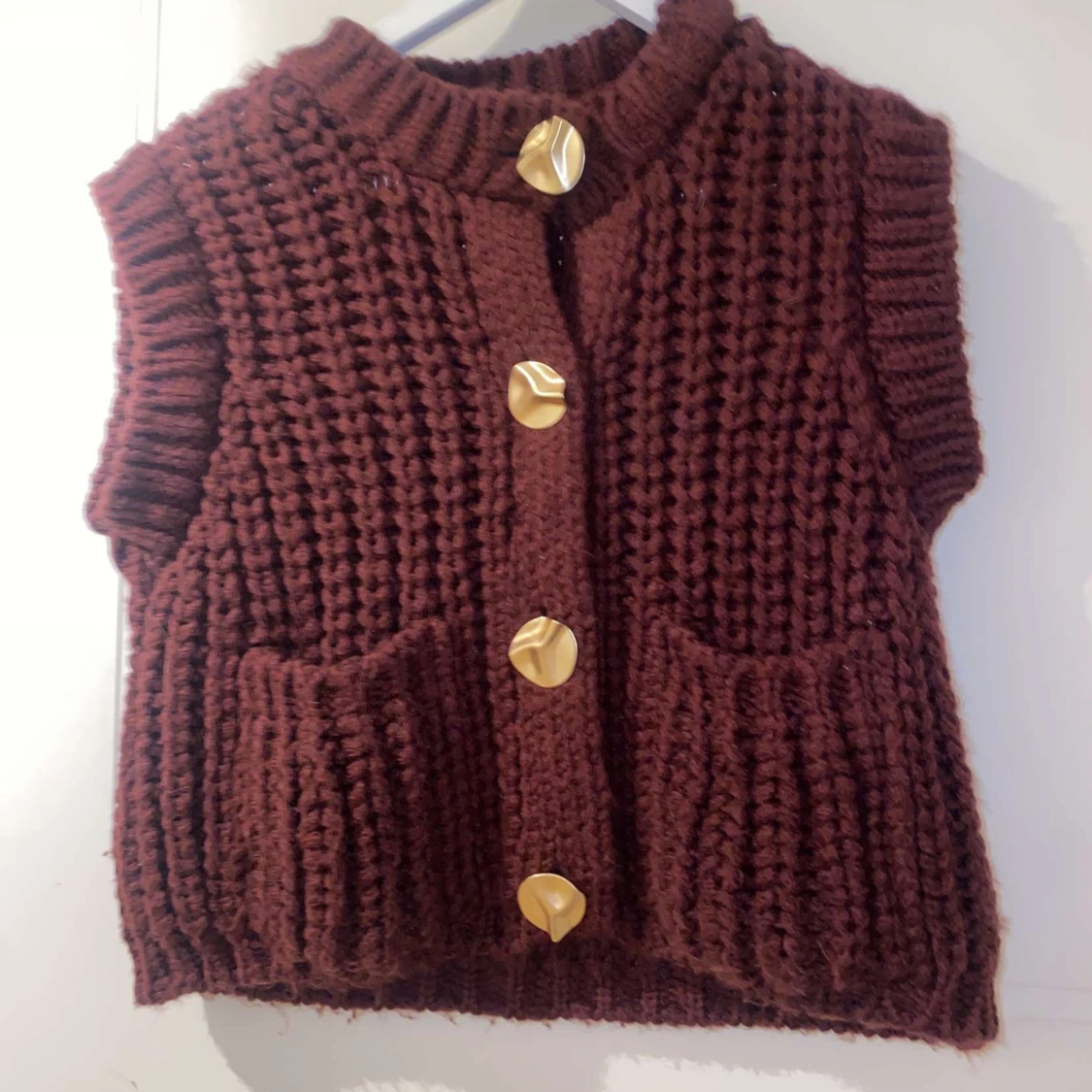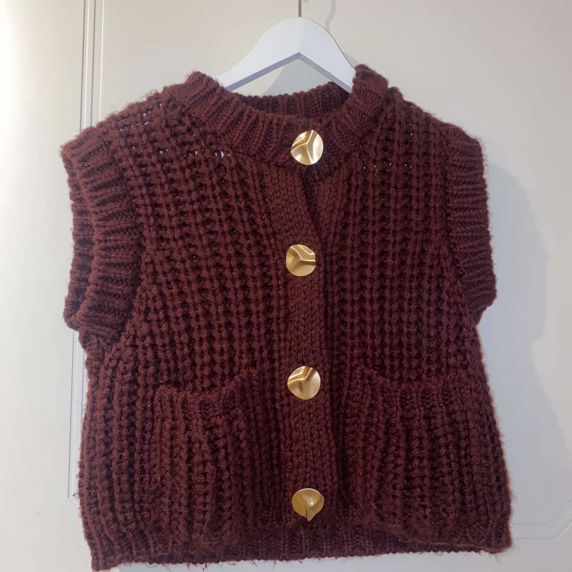Mysig stickad väst med grov struktur och stora, runda guldknappar framtill. Västen har två praktiska fickor och en hög krage. Perfekt för lager-på-lager och en snygg detalj till din outfit.