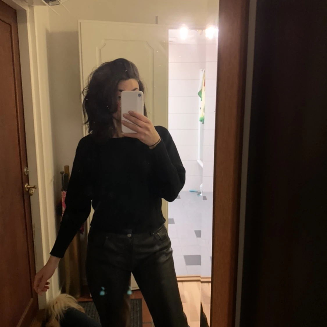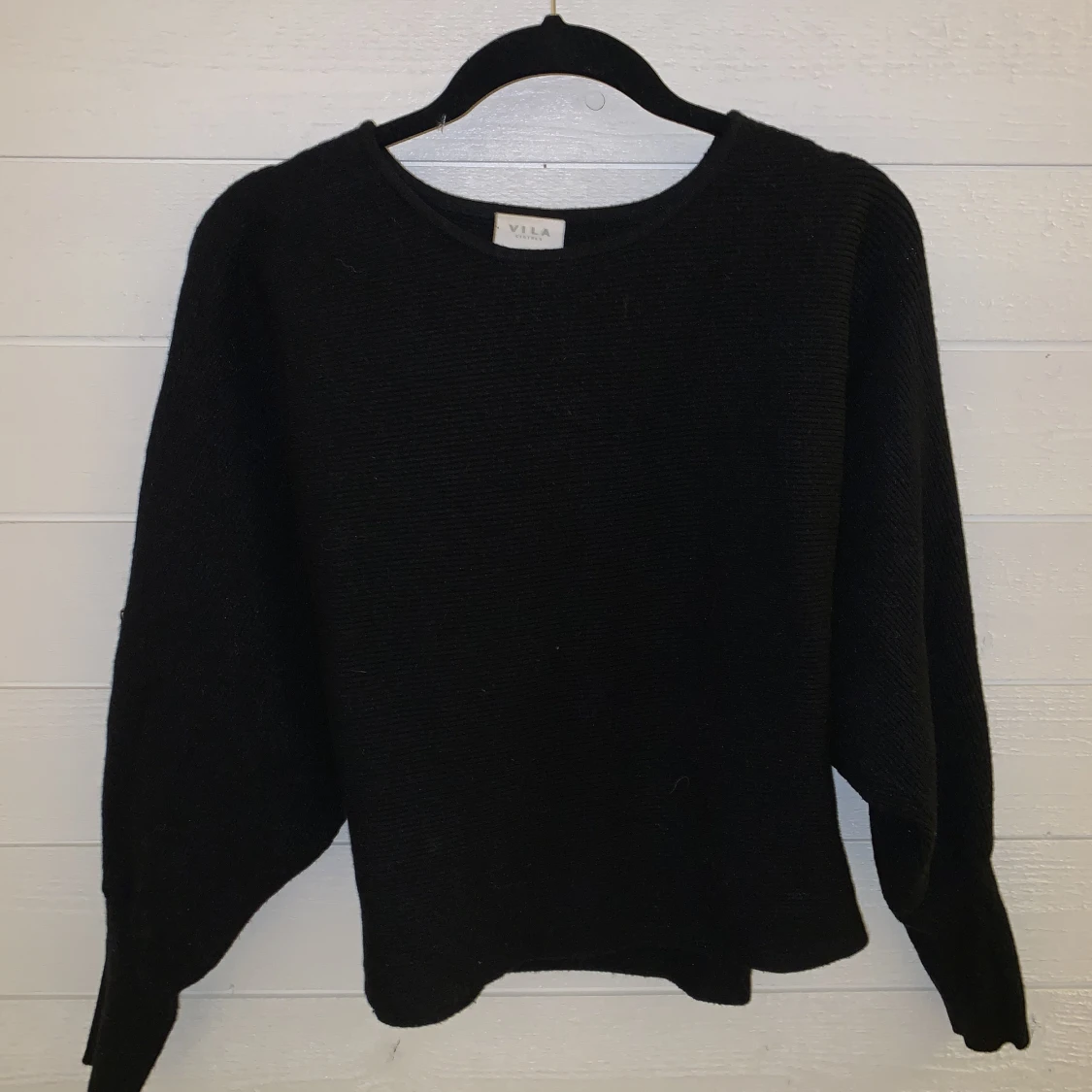 Snygg svart midjetröja i stickat material. Snygg att både ha till läderbyxor och jeans! Puffärmar med smalare tyg nertill på ärmen. Passar utmärkt till s och xs. Är 164 och den är lite kort i ärmarna.