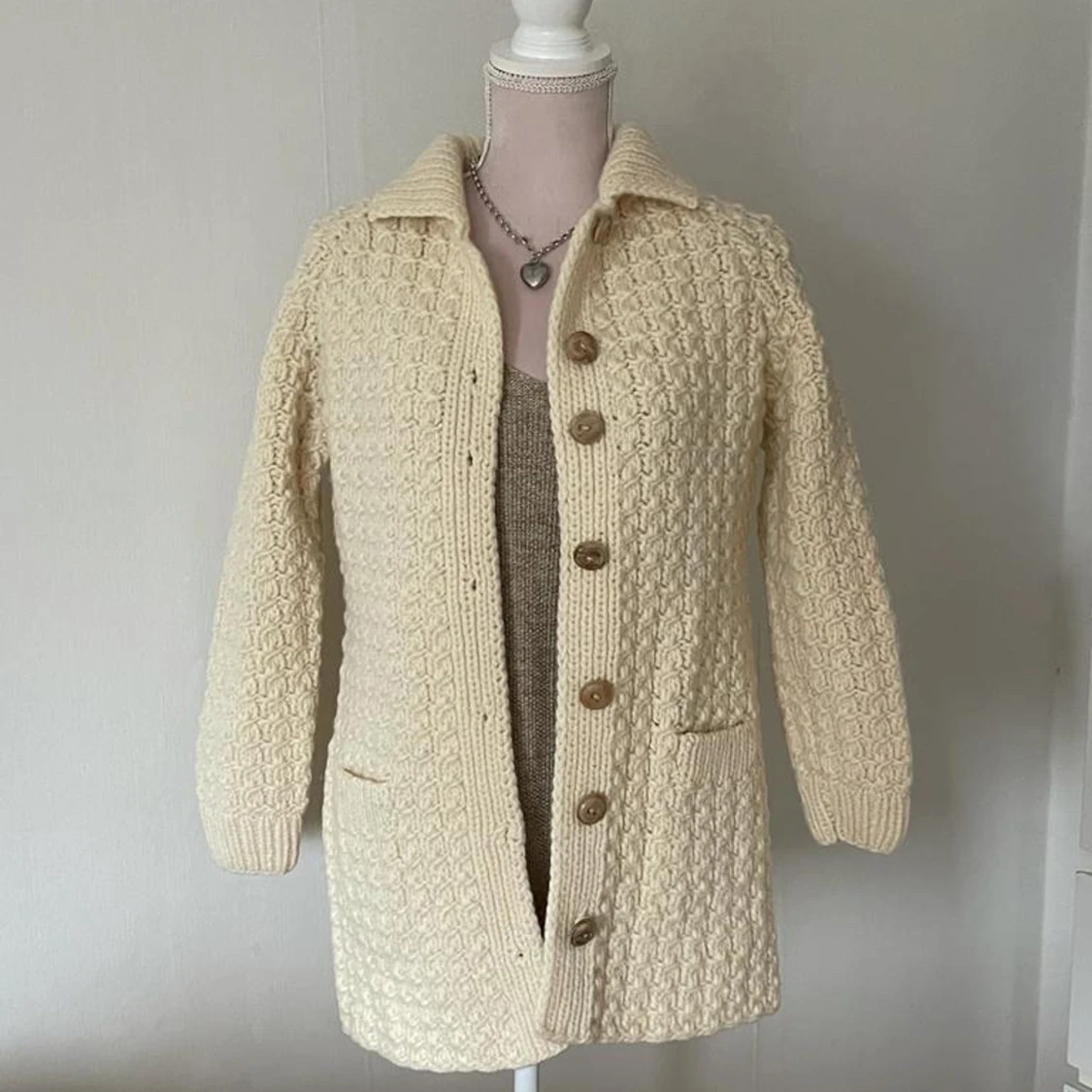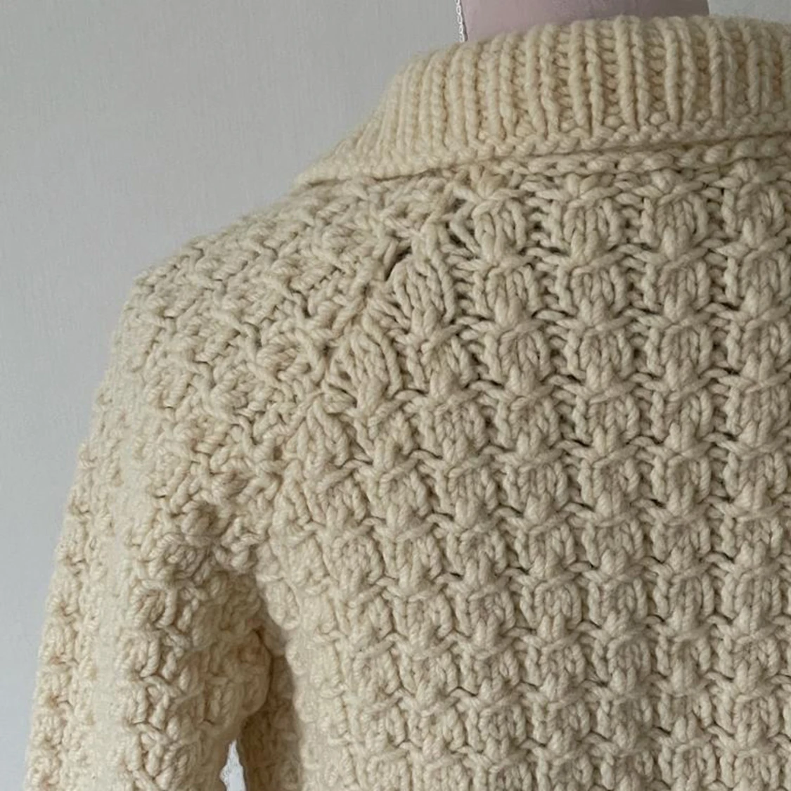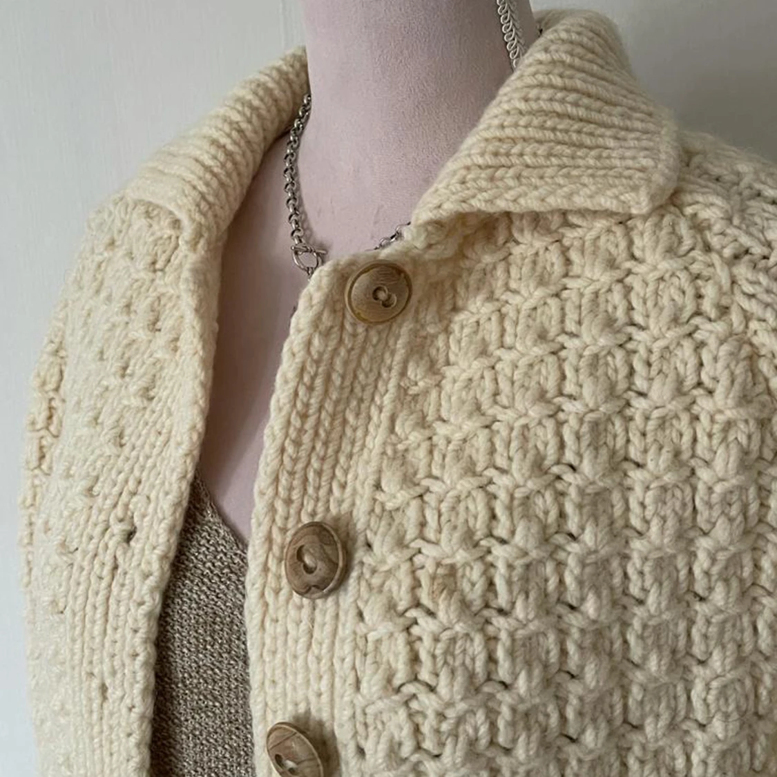 Varm stickad kofta storlek S. Riktig ull. Krämfärgad och oanvänd. Kan posta men kan också mötas upp och och lämna över i Uddevalla, Trollhättan, Vänersborg och Mellerud. :)