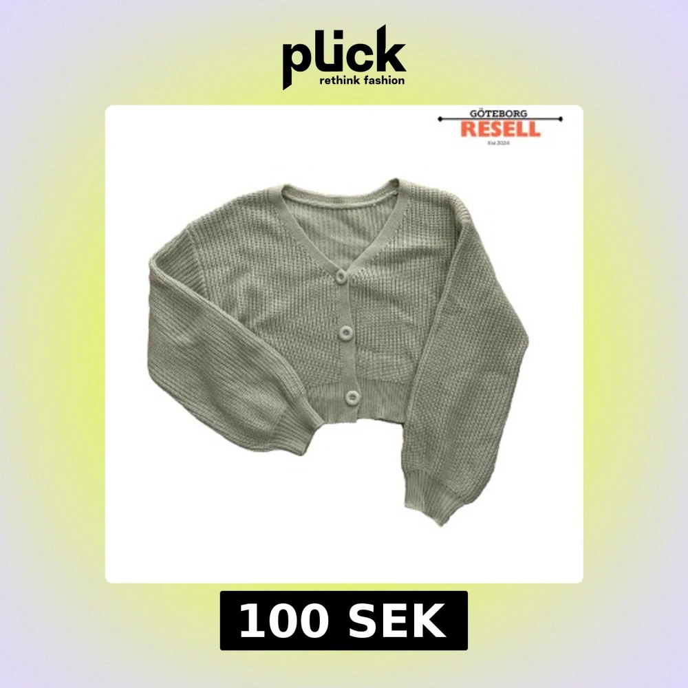 Superfin ljusgrön stickad kofta med v-ringning och stora knappar framtill. Modellen är croppad och har långa ärmar med breda muddar. Perfekt att slänga över en topp. Använd kanske en gång. Skick 9/10