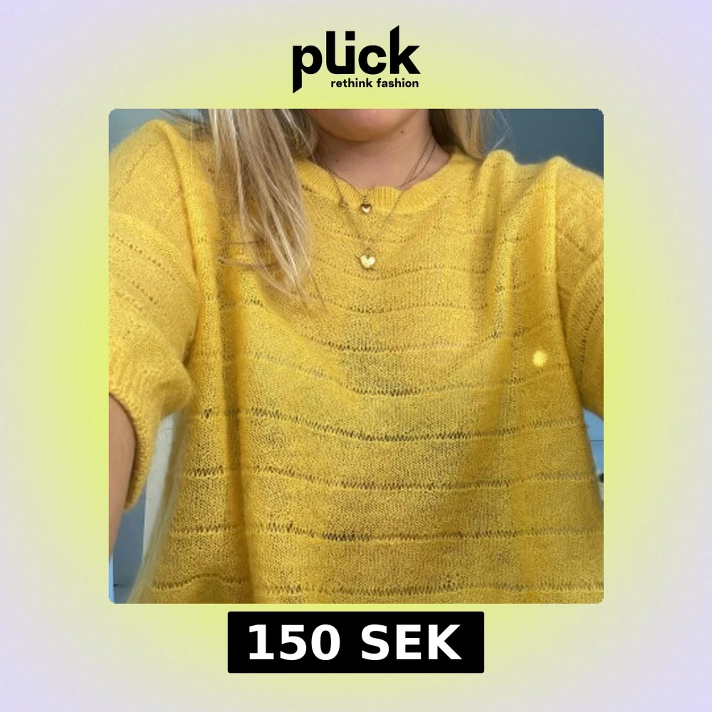 Superfin gul stickad tröja från Marie Sixtine i kid mohair. Tröjan har ett luftigt, transparent stickat mönster med horisontella ränder och kortare ärmar. Perfekt för dig som gillar färg och vill ha en mysig men lätt tröja till garderoben.