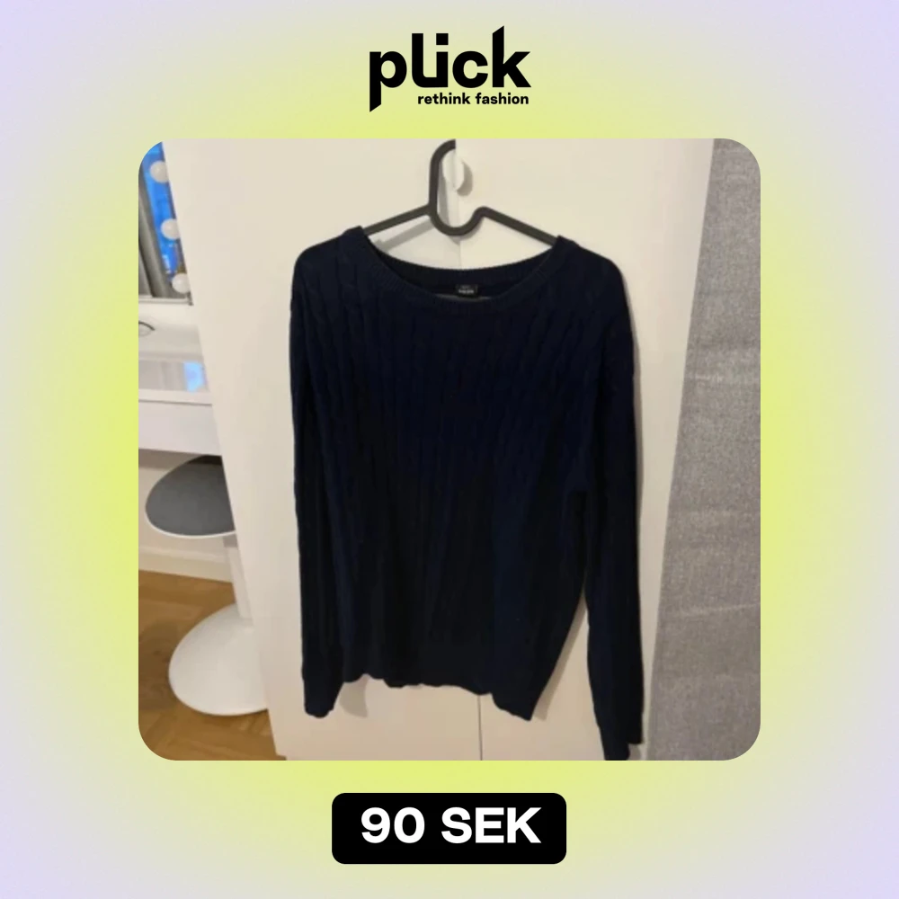 mörkblå stickad tröja med flätat mönster, knappt använd, passar xs-l