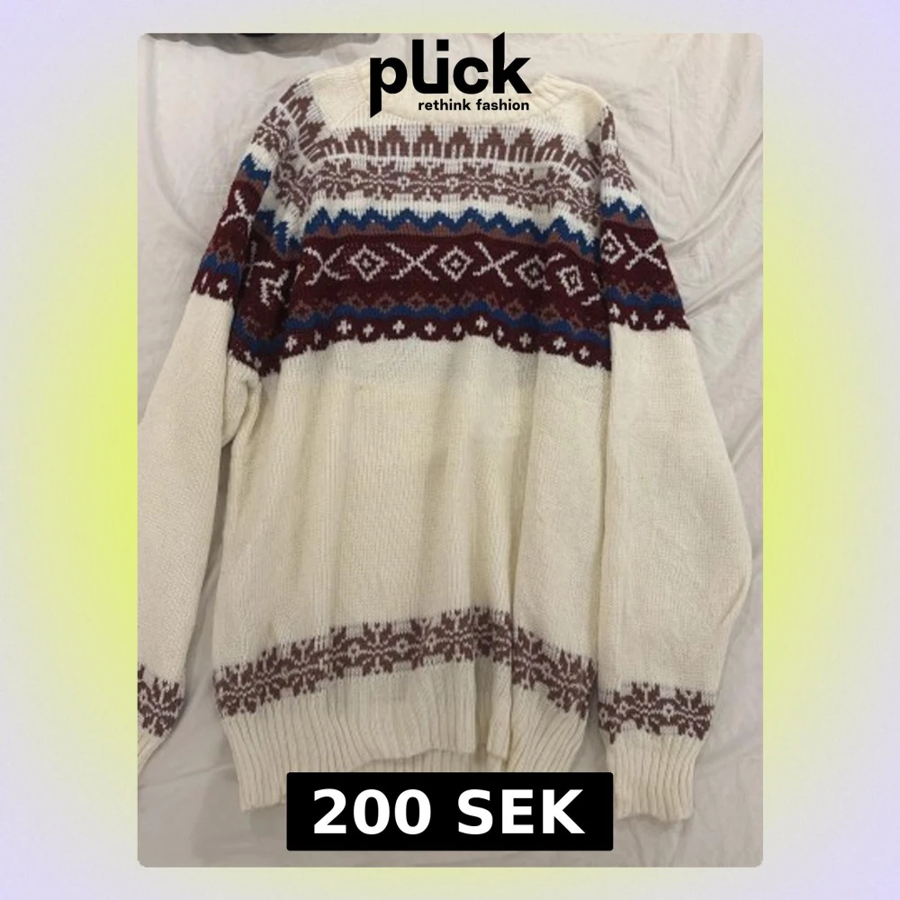 Mysig stickad tröja i vitt med vinröda och blå mönsterdetaljer. Tröjan har rund halsringning, långa ärmar och ribbade muddar. Perfekt för kyliga dagar och ger en klassisk vinterlook. Den är oversized, står XL men skulle säga mer M