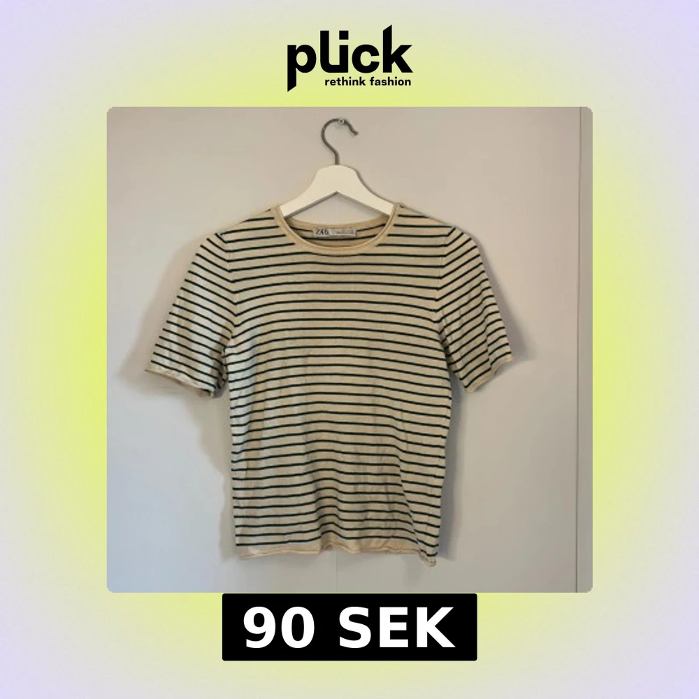 Snygg stickad randig t-shirt från Zara i cremevit/ grön. T-shirten har korta ärmar och rund halsringning. Perfekt för en avslappnad och stilren look.