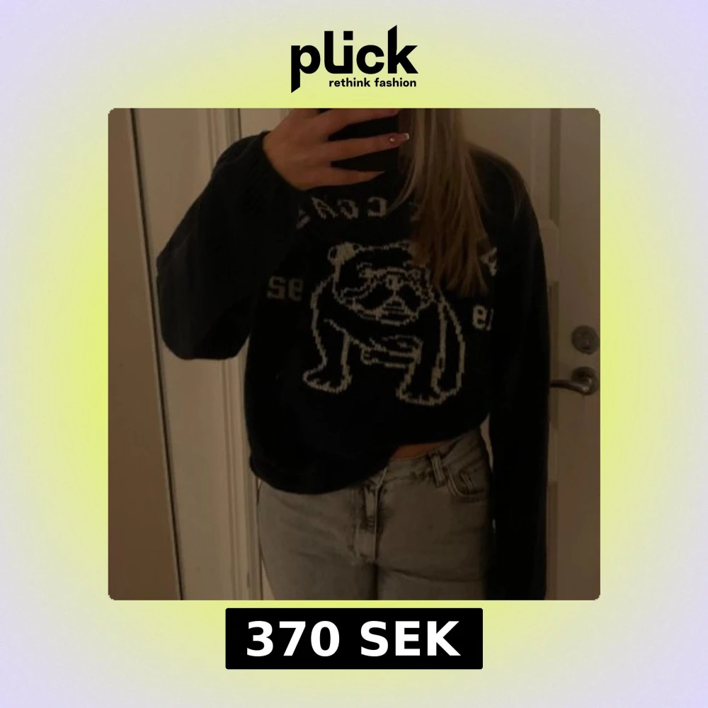 Mörkblå Stickad tröja med tryck, aldrig använd! I storlek xs men passar även S. Köpt för 489kr🥰