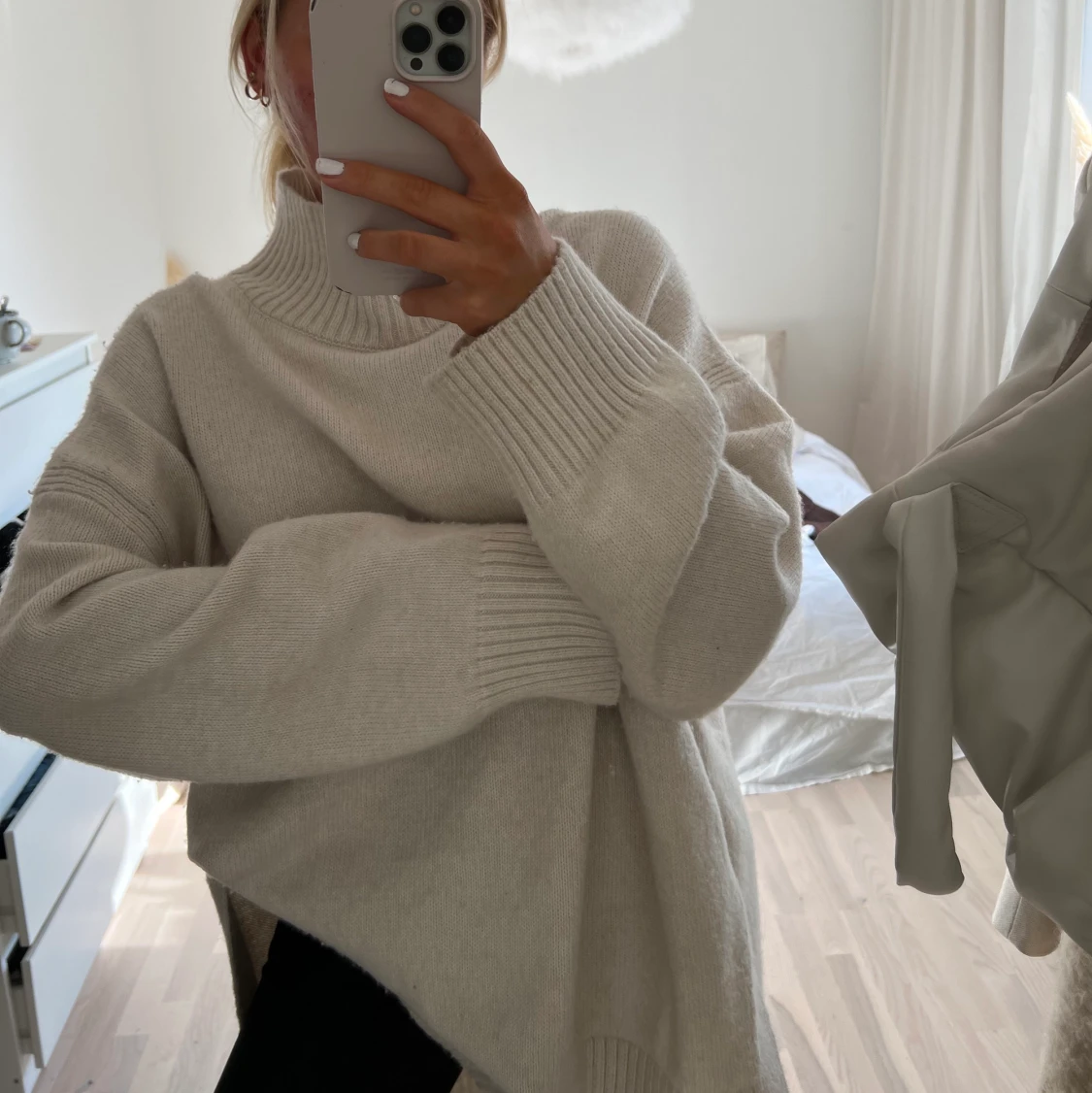 Jättefin stickad tröja från hm, snygg krage och slits på sidorna. Den är i en oversized modell men sitter perfekt på mig som vanligtvis har storlek S🫶🏻