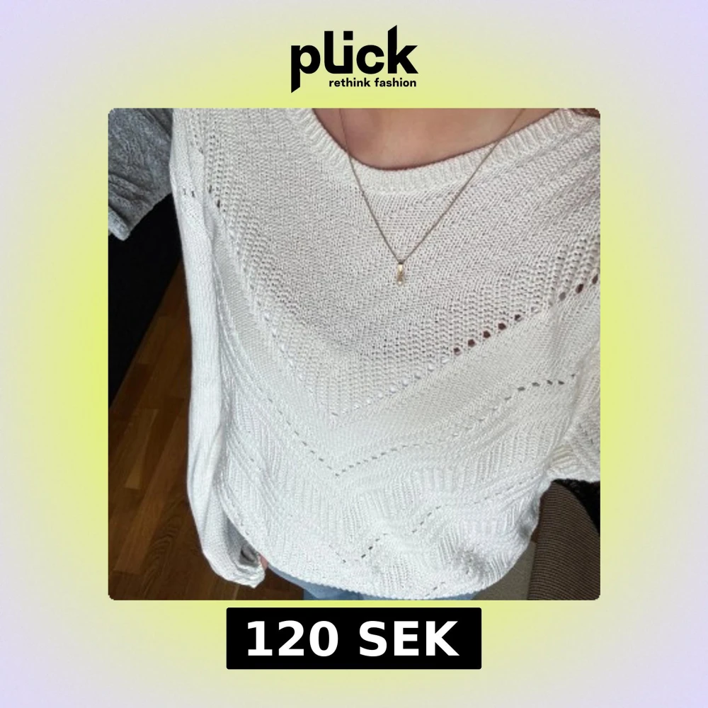 Vit stickad tröja med snyggt V-format hålmönster över hela framsidan. Tröjan har rund halsringning, långa ärmar och ribbade muddar vid ärmslut och nederkant. Perfekt att styla med jeans för en clean look.