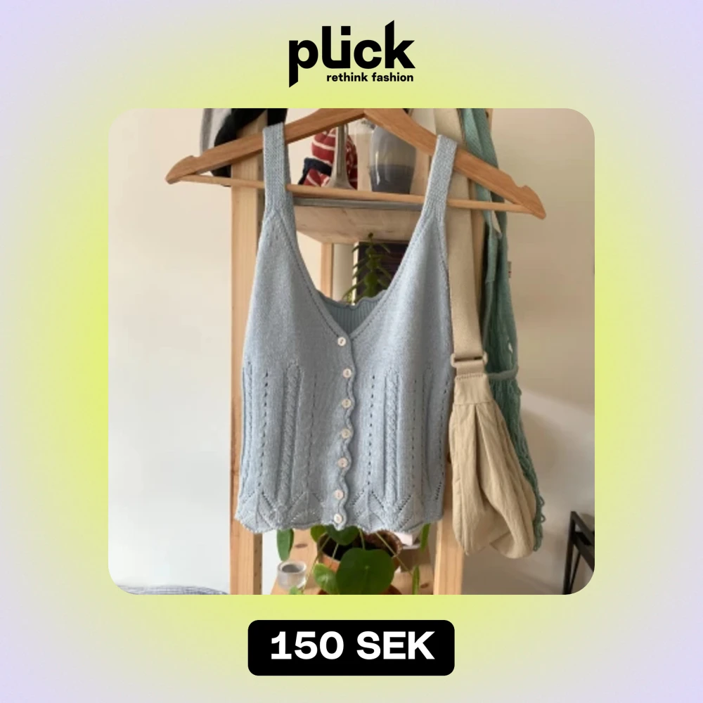 Ljusblått stickat linne köpt second hand. Bra skick förutom ena axelbandet som någon sytt på själv, lätt att åtgärda 🌷