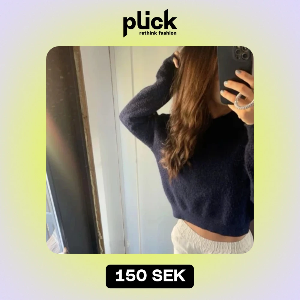 Säljer en mörkblå stickad tröja. Har en normal passform, lite kortare i modellen, bra skick så den inte är för använd