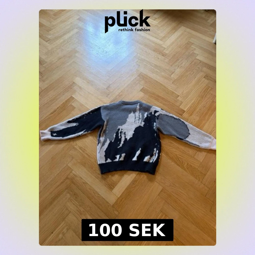 Cool stickad tröja med abstrakt mönster i svart, grått, beige och vitt. Tröjan har rund halsringning och ribbstickade muddar vid ärmslut och nederkant. Perfekt för dig som gillar unika plagg med streetkänsla.