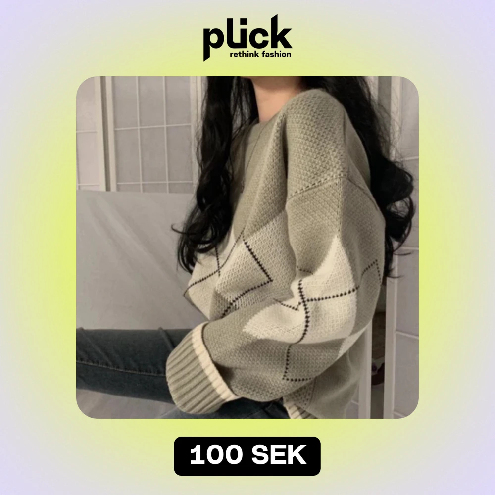 Stickad tröja med argyle-mönster för höst och vinter. Långärmad, o-ringad och lite lös passform. Perfekt för en avslappnad vintage-look med koreanska vibes.