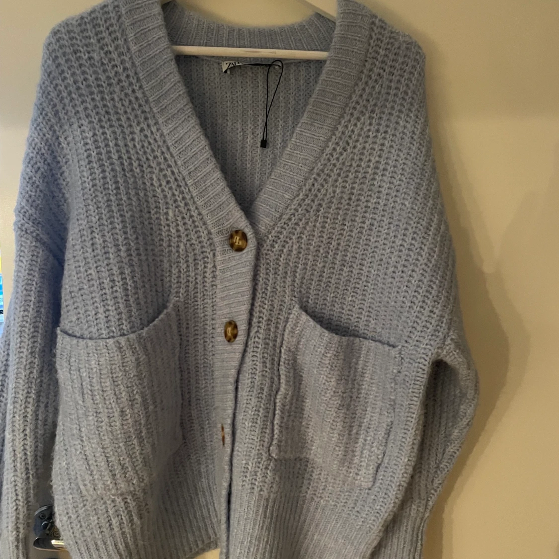 Fin stickad kofta från Zara I färgen ljusblå perfekt att ha till sommarkvällarna. Använd 1 eller 2 gånger, nyskick Storlek S