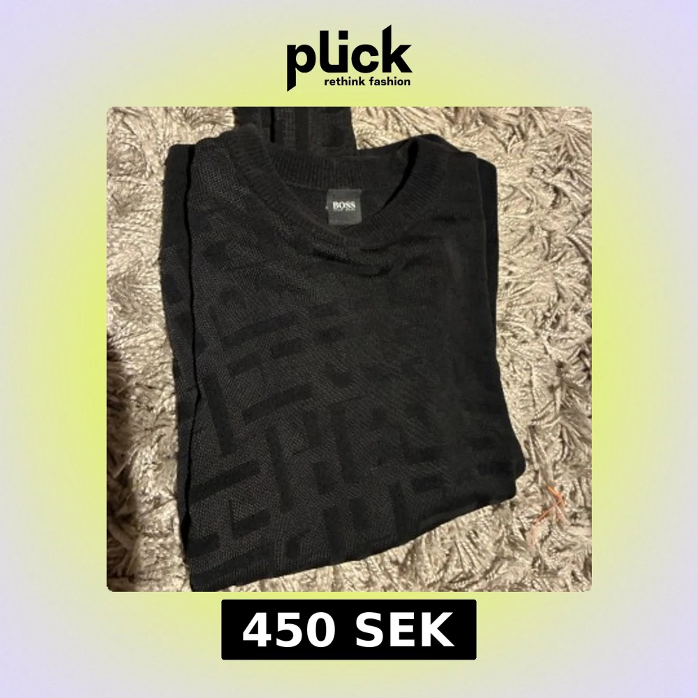 Svart stickad tröja från BOSS med diskret mönster i samma färg. Rund halsringning och mjukt material som känns skönt mot huden. Perfekt för dig som gillar stilrena plagg. Storlek s men passar även M